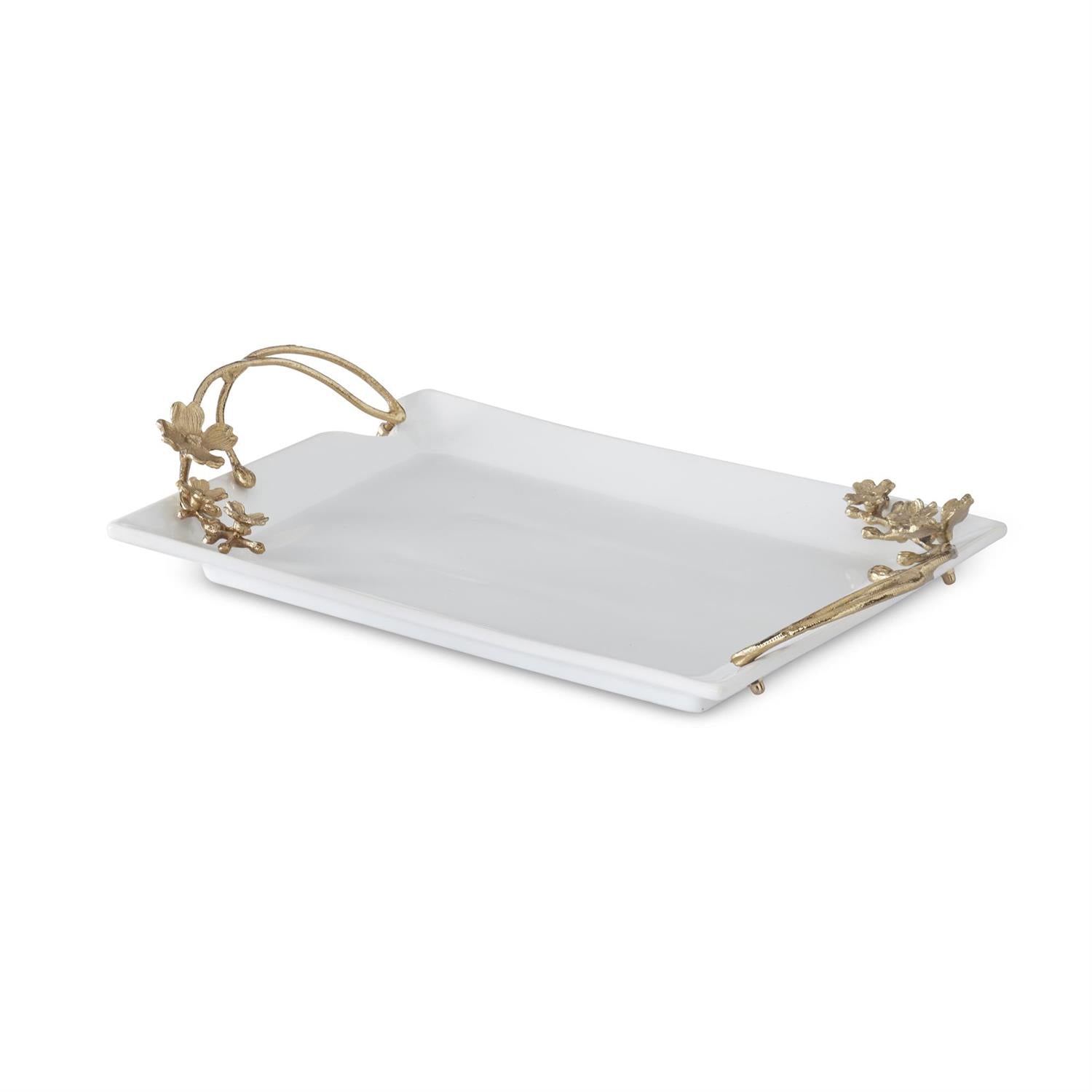 18 Inch White Ceramic Rectangular Tray w/Gold Metal