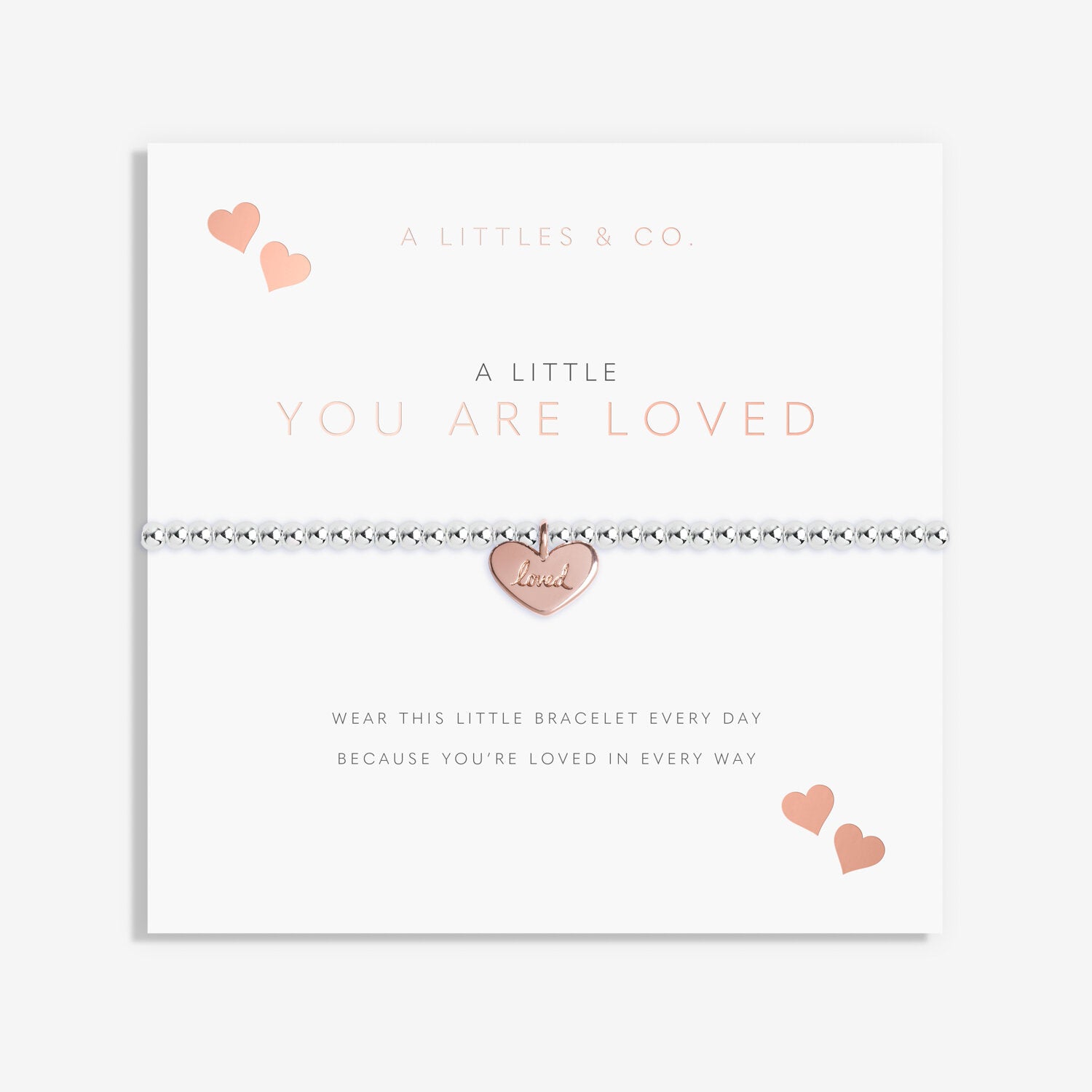 Our A Little 'You Are Loved' Bracelet features a captivating design that will dazzle with every movement. Featuring a stretch-bead style and a beautiful silver-plated charm, wrapped around one of our stylized cards and framed by a sweet poem. It's oh-so special.