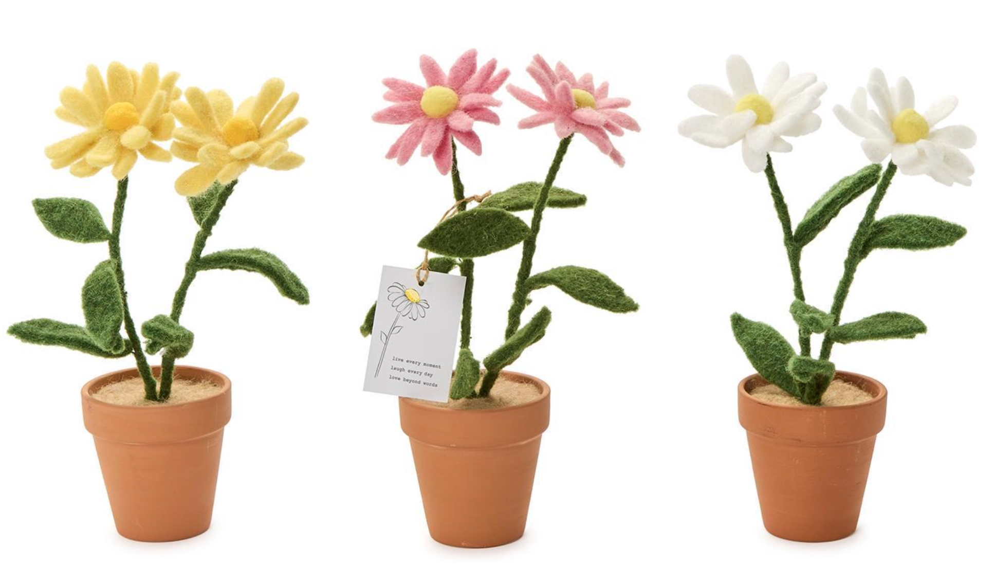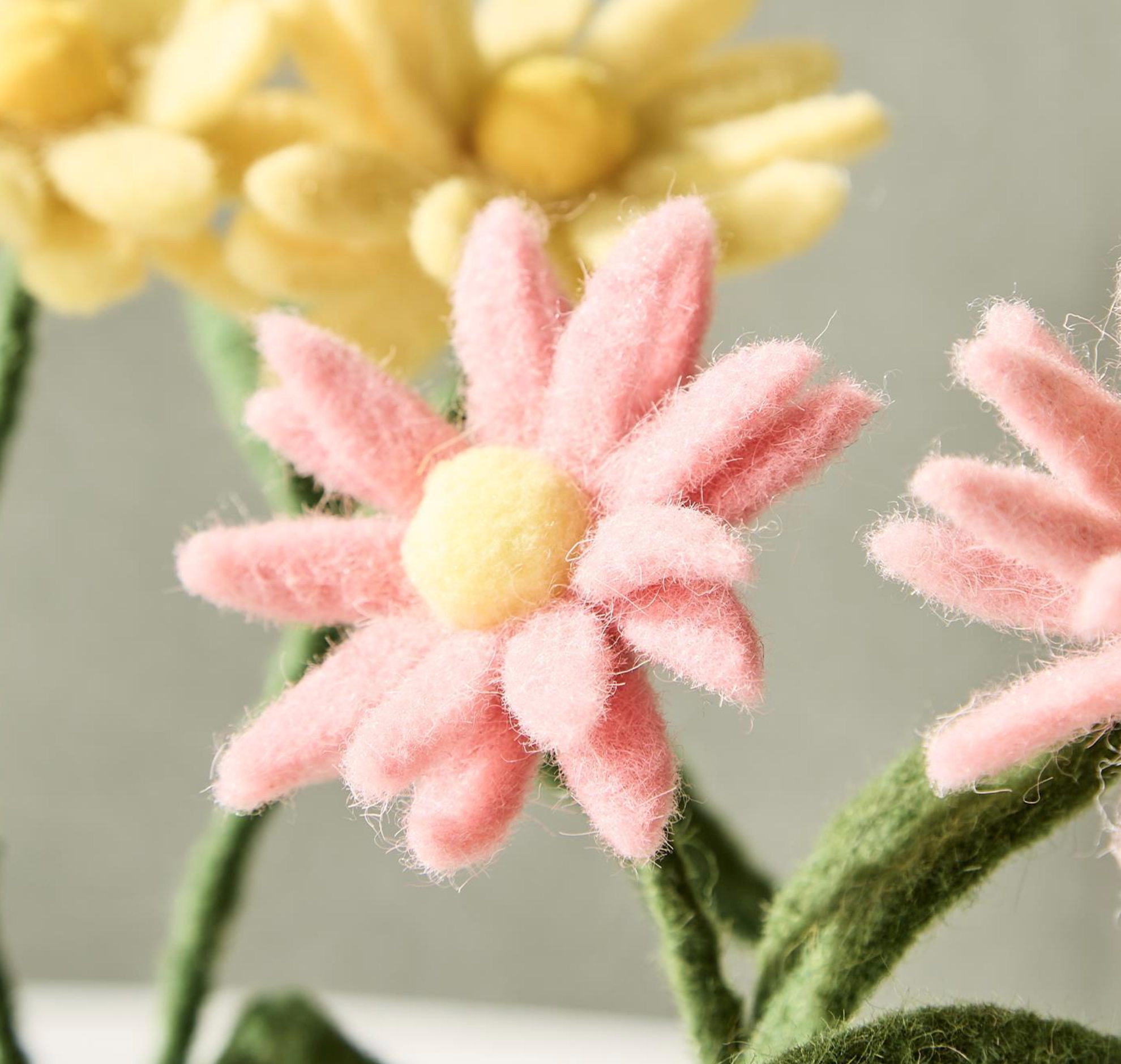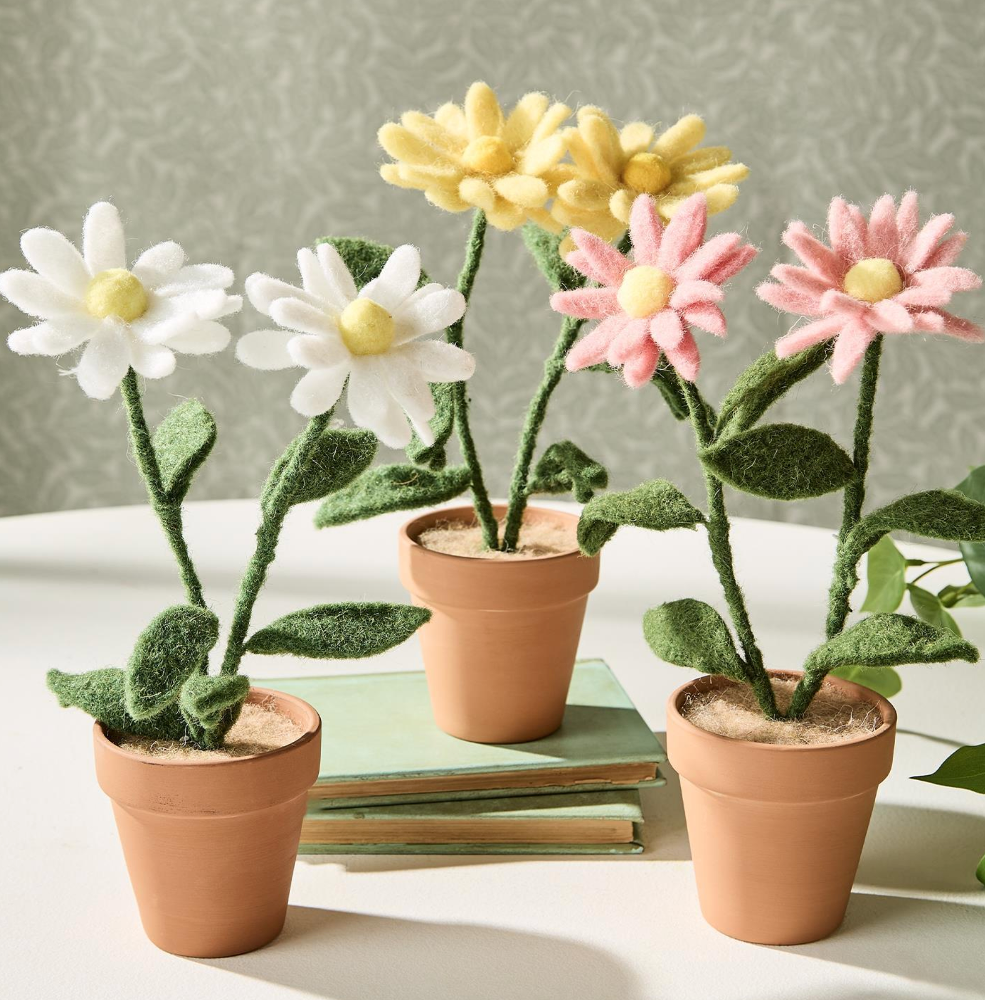 Enjoy the beauty of blooming flowers in your home year-round with our hand-crafted potted daisy, available in three colors. Each plant is meticulously crafted by hand from wool felt and sits inside a classic terracotta pot. Perfect for tabletops, windowsills, or as a thoughtful gift, these potted daisies are a cheerful addition to any decor.