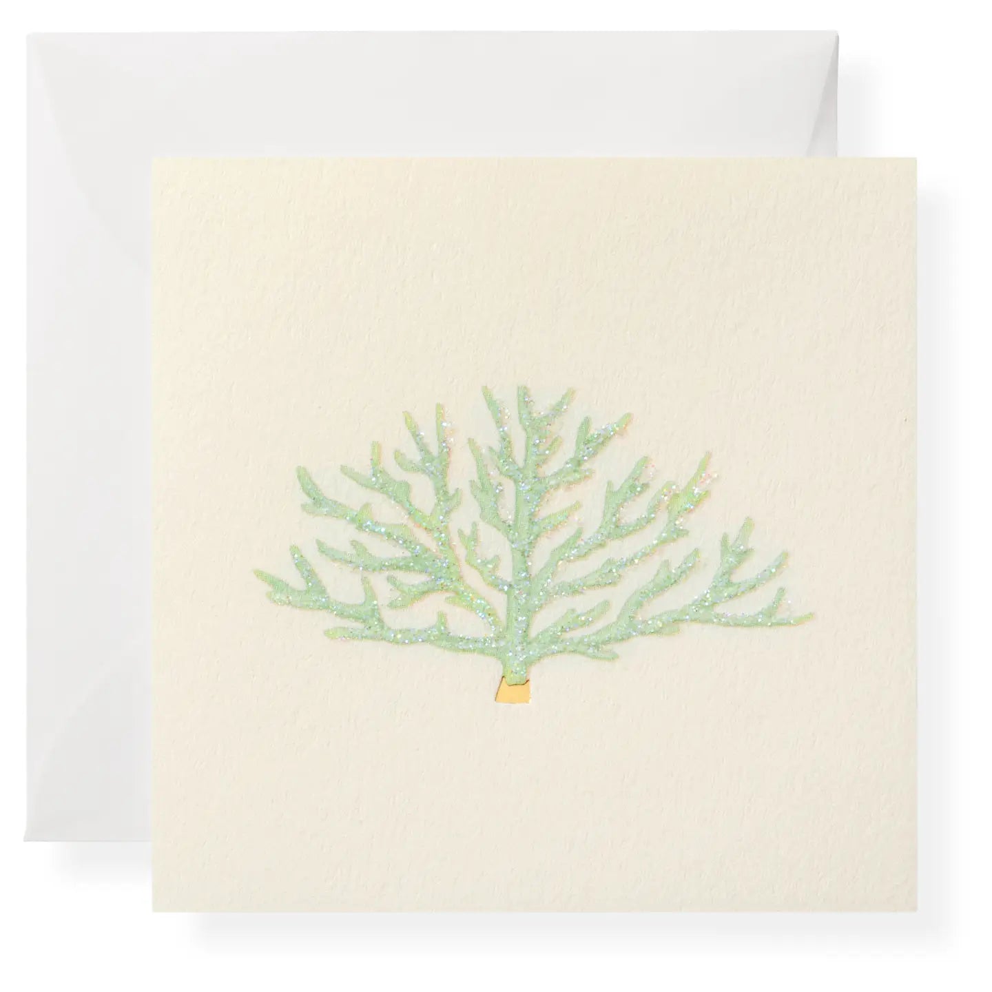 This Blue Coral Gift Enclosure is printed and hand-glittered in Memphis, TN. Hand crafted artwork, full color ink printed on natural white paper, foiled, hand-glittered, and paired with a vellum envelope. Book-folded enclosure card, blank on the inside. Paper color | natural white. Envelope color | vellum. Print process | full color + letterpress Embellishment | hand-glittered + gold foil Dimensions | 3 x 3 inches.
