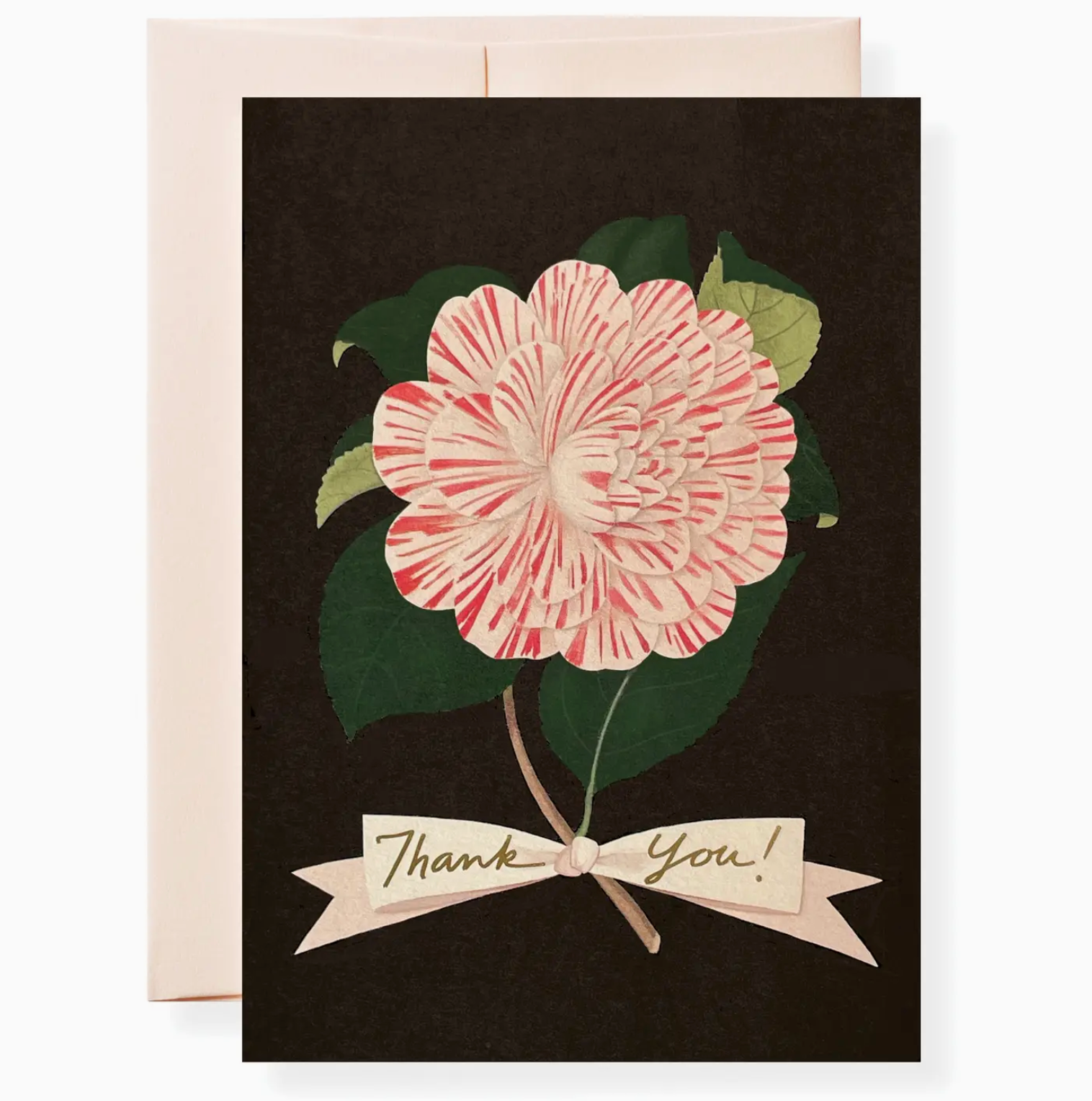 This camellia thank you greeting card is printed and foiled in Memphis, tn. Full color ink printed on natural white paper, letterpress printed in gold foil and paired with a pale pink envelope. Book folded card, blank on the inside.