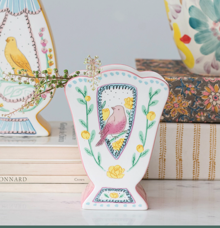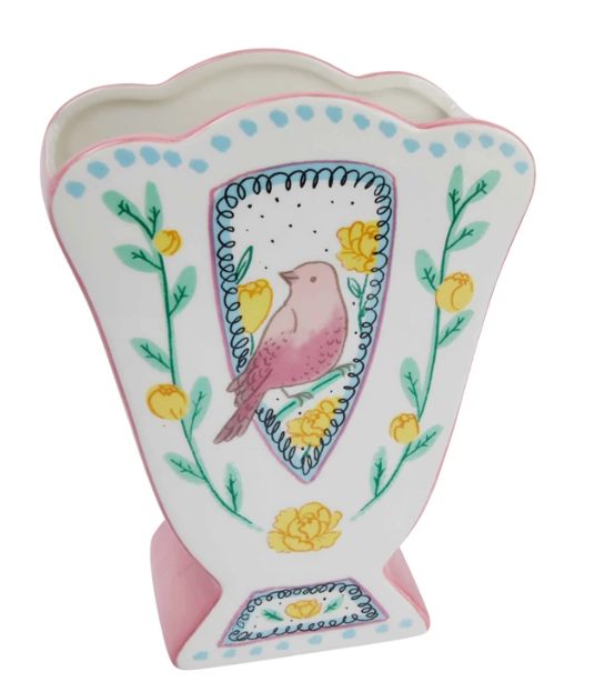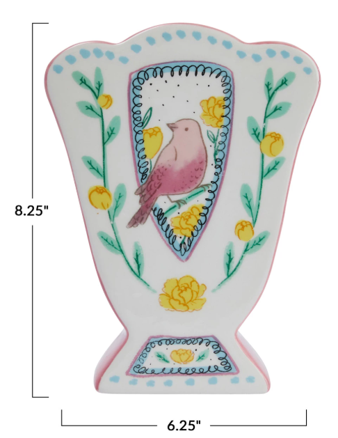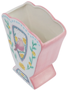 This lovely vase adds whimsy and charm to any home. The ceramic vase features a fan shape that creates a graceful and elegant silhouette. The vase also has a scalloped edge that adds some texture and detail to the design. The vase is adorned with a bird motif that showcases various colors such as green, pink, white, blue, and yellow. The vase does not have drainage holes, making it versatile for different uses. It can be used as a decorative vase for flowers, branches, or greenery. The vase is made of dolomite, a type of ceramic that is smooth, glossy, and durable. The vase measures 6.25 inches in length, 3.25 inches in width, and 8.25 inches in height, making it a sizable and beautiful piece that can fit in any space. Whether displayed on a mantel, shelf, table, or counter, this vase enhances the décor with its whimsy and charm. A lovely vase that features a fan shape, a scalloped edge, and a bird motif in multiple colors. Ideal for adding some whimsy and charm to the cottage, vintage, or shabby chic home décor. It can be used as a decorative vase for flowers, branches, or greenery. Made of dolomite.