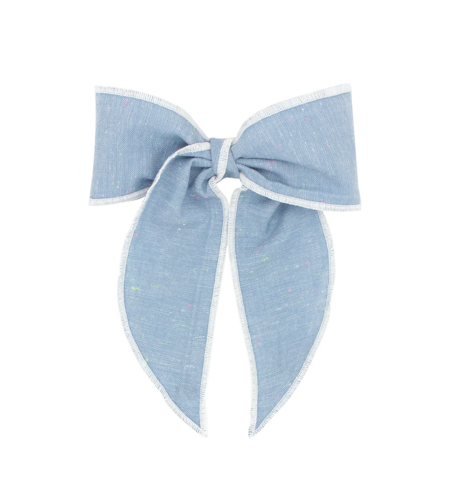 This is the perfect bow for the little princess who loves to stand out in a crowd. The solid chambray colors and twisty wrap create a look of playful sophistication that will never fail to make a statement. The whimsy tails are 4 1/2 inches in length. This bow is sure to stay in her hair all day with our patented WeeStay™ no-slip hair clip.