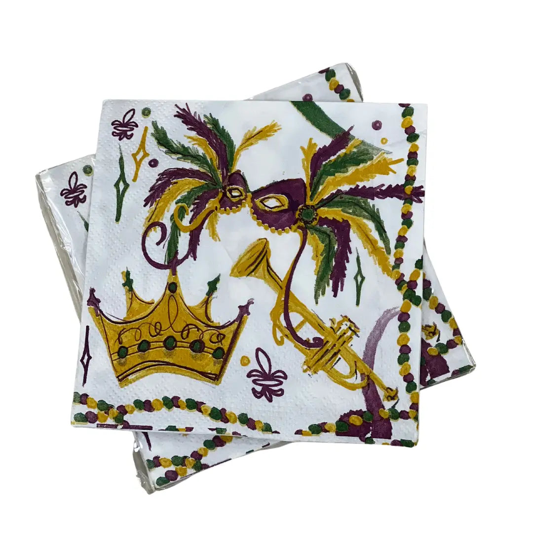 These small cocktail napkins featuring our new Mardi Gras design. Artwork features a beautiful Mardi Gras Mask, along with feathers, musical instruments and crowns throughout all in purple, green and gold (yellow) colors. Designed by local artist, Bridget Prater. 5" x 5" each pack contains 20 napkins enclosed in cellophane