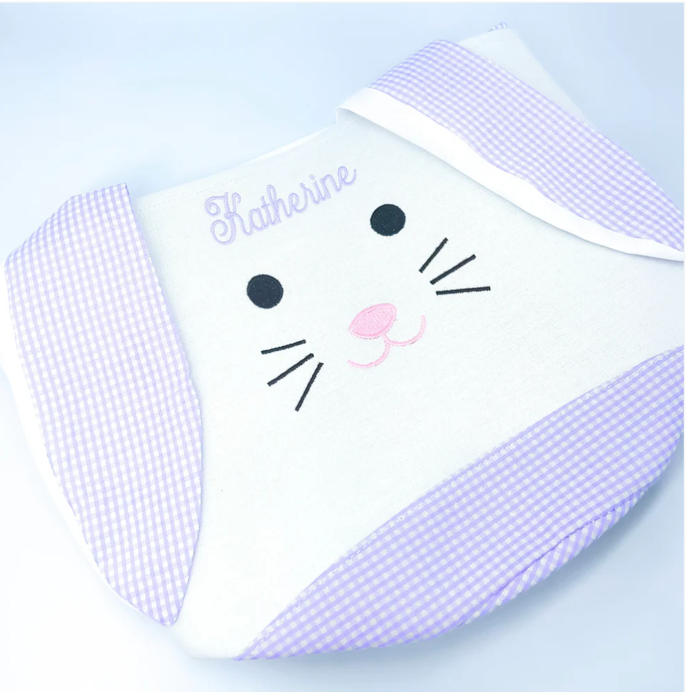 Celebrate the magic of springtime with a seersucker-trimmed Bunny Basket made for egg-hunting, Sunday morning surprises, and all of the excitement that the holiday has in store. With bunny ear straps and sweet bunny face embroidery, these large cotton totes are constructed of soft stone canvas and pastel seersucker and can be customized with a name or monogram for that extra special added detail.