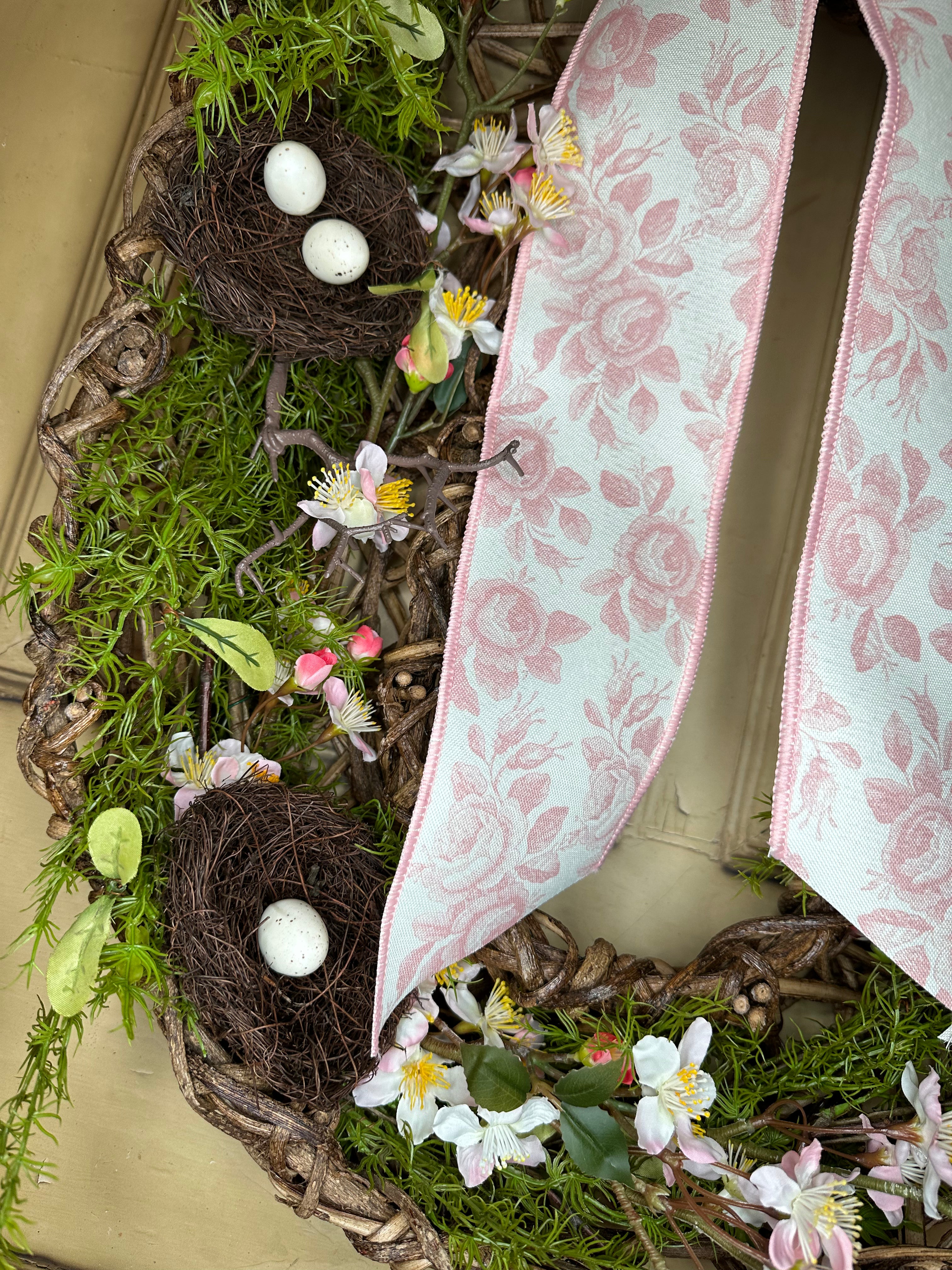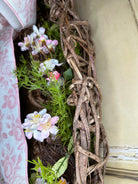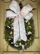 Our Oval Wicker Wreath decorated with a beautiful blush bow, flowers, greenery, and flowers.