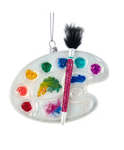 This glass water color palette and paint brush ornament is a festive addition to any holiday décor or Christmas tree. It features a glittered white palette with multicolor water color paints and a pink glittered paint brush.