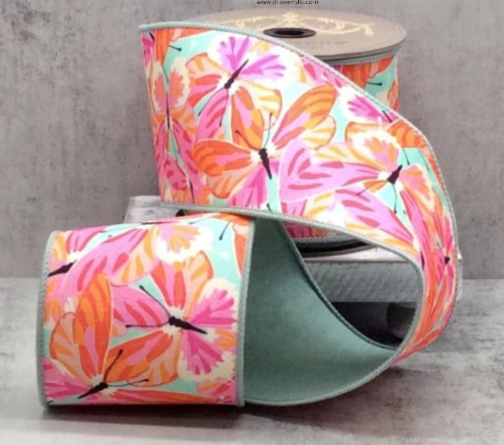 Description: 4" x 10yds dupion colorful orange hot pink butterflies, celadon
