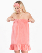 Blissfully cozy, Bella's plush spa wrap is the ultimate apres-shower delight. With ultra-soft fabric and a sweet ruffle accent, you won't want to get dressed. Never again will your towel slip off while blow drying your hair or applying makeup. Our best-selling spa wraps are a must for the graduate, bridesmaid, new mom, or girlfriend. These spa wraps are made with a soft elastic band across the back and finished with a Velcro closure in front.