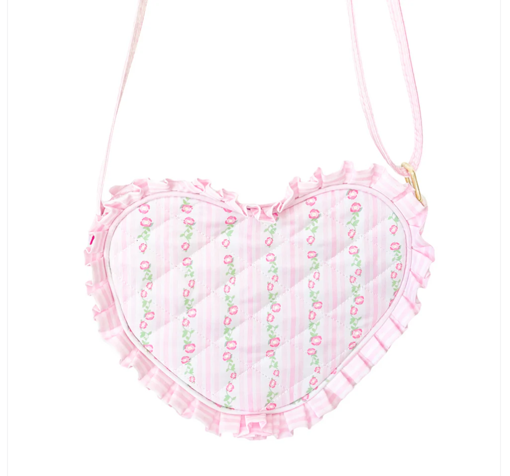 Every little girl-on-the-go needs a go-to bag as sweet and special as she is. With a soft, striped Palmer Pink cotton seersucker heart-shaped body, polished gold heart Bits & Bows logo charm and hardware, matching ruffle trim, adjustable crossbody strap, and wipe-clean lining, it’s a functional, feminine accessory she’s sure to just love season after season.