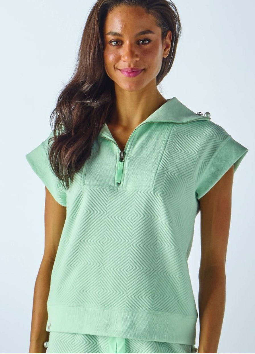 This quilted quarter zip features, quilted fabric body, drop shoulder sleeve construction , faux pearl and rhinestone collar embellishments, zip mock neck collar design, and Simply Southern logo hem label. Made of 100% polyester.