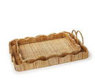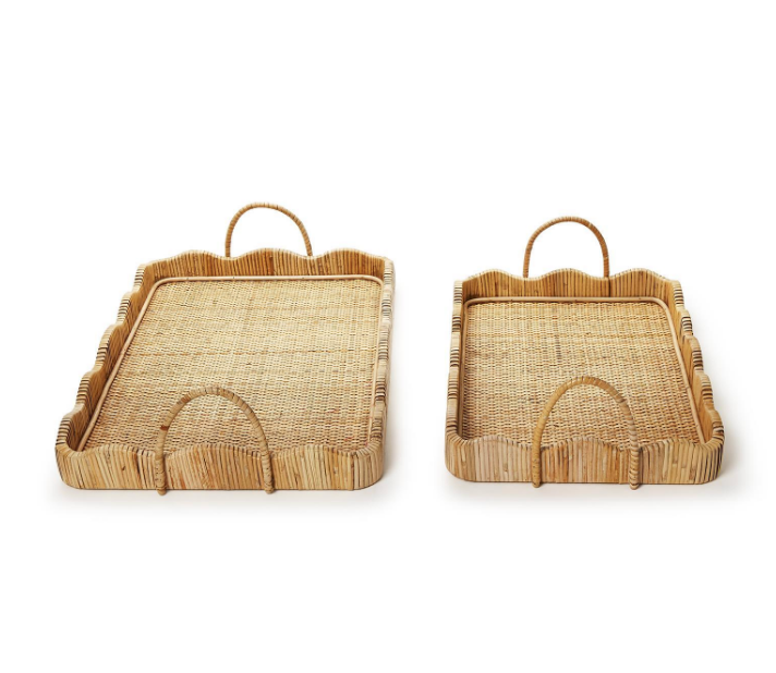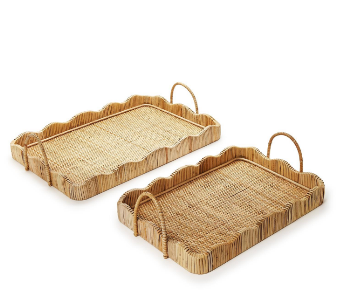 Elevate your space with the timeless charm of Scalloped Edge Trays with Handles. Crafted from rattan each tray boasts a unique hand-crafted origin, showcasing natural imperfections that add character and warmth to your decor. The set includes two sizes, perfect for styling together or separately in your living room, bedroom, or kitchen. Whether displayed on a coffee table with candles and books or used to serve drinks to guests, these trays effortlessly blend style and functionality.