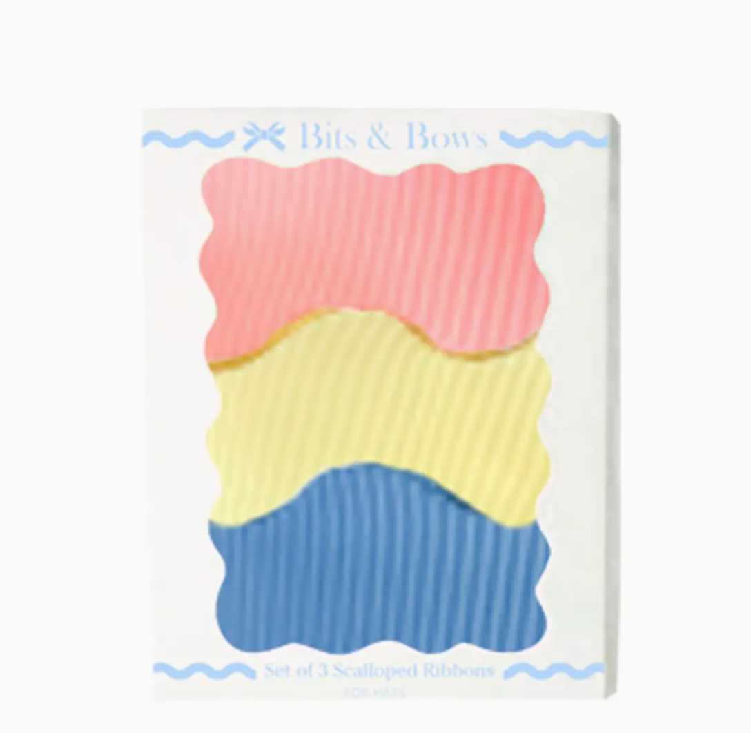 • Each set includes 3 long wavy scalloped grosgrain ribbons in vacation-ready vibrant shades: coral, light yellow, and azure blue