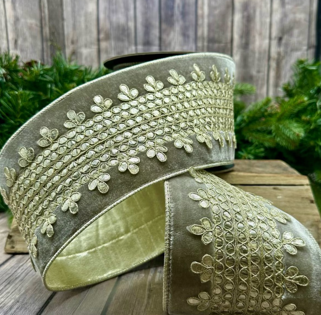 Description: 4" x 5yds velvet platinum center trim, platinum