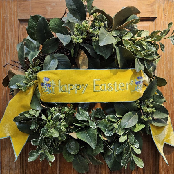 Velvet Yellow banner with light green "Happy Easter" and floral embroidery, backing is a Robins Egg Blue silk-like fabric.