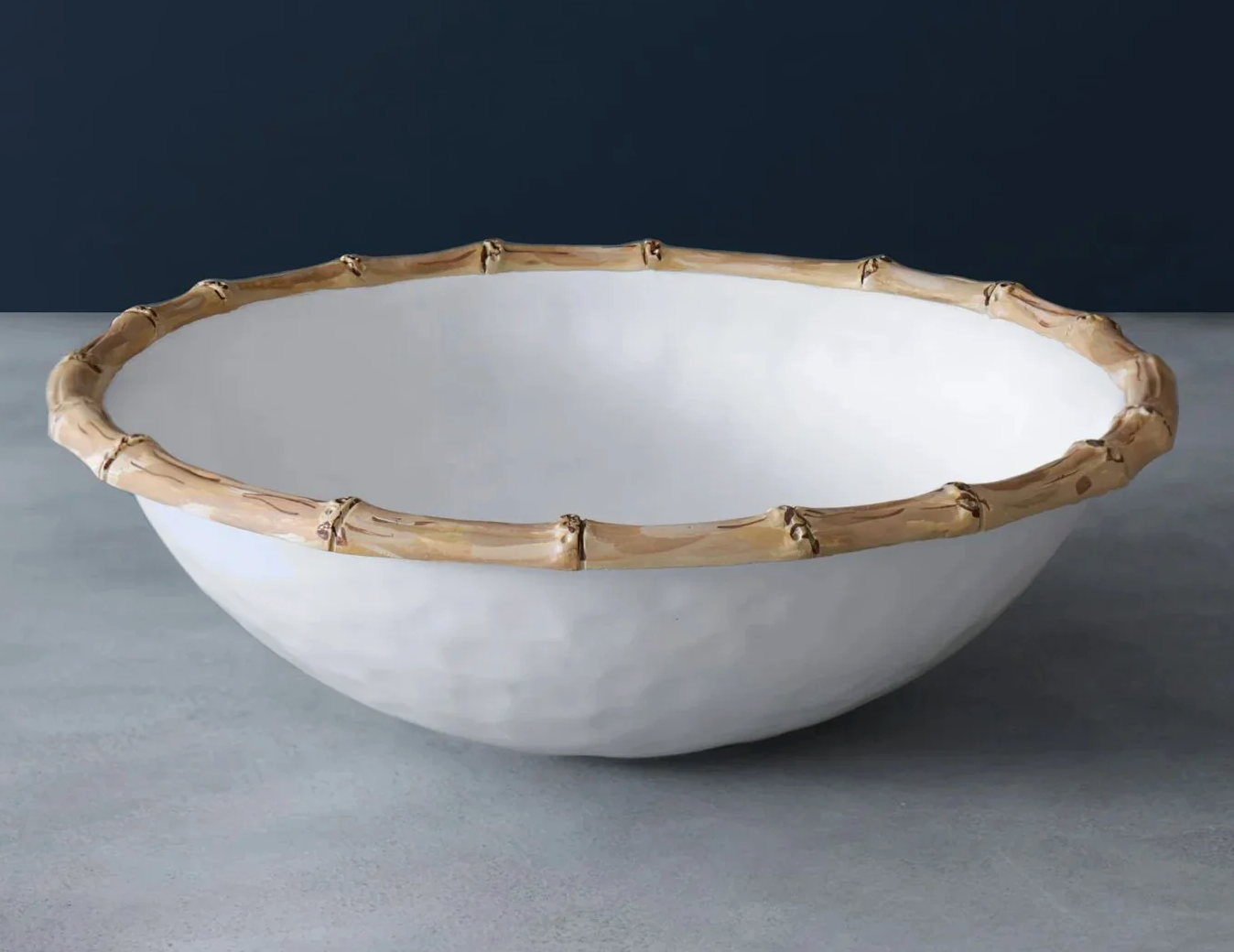 With a bamboo inspired rim and a brilliant white surface, the stylish and generous bowl works well with our VIDA Bamboo dining sets, serving pieces and flatware. Create a table with a carefree and classy Beatriz Ball twist! It looks great when sharing a table with GARDEN Bamboo items from our signature metal line too. Perfect for a variety of serving needs, the bowl has the luster, heft and look of a ceramic piece.