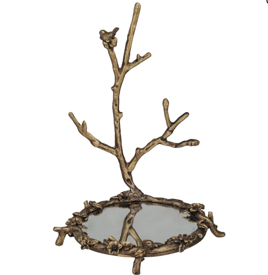 Pewter Jewelry Holder w/ Mirror & Bird on Branch, Antique Gold Finish