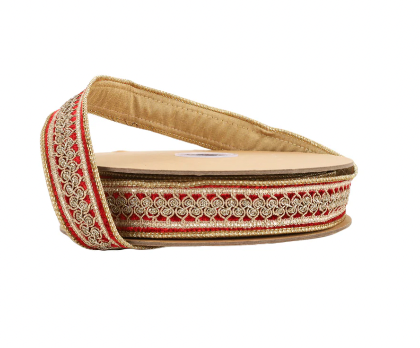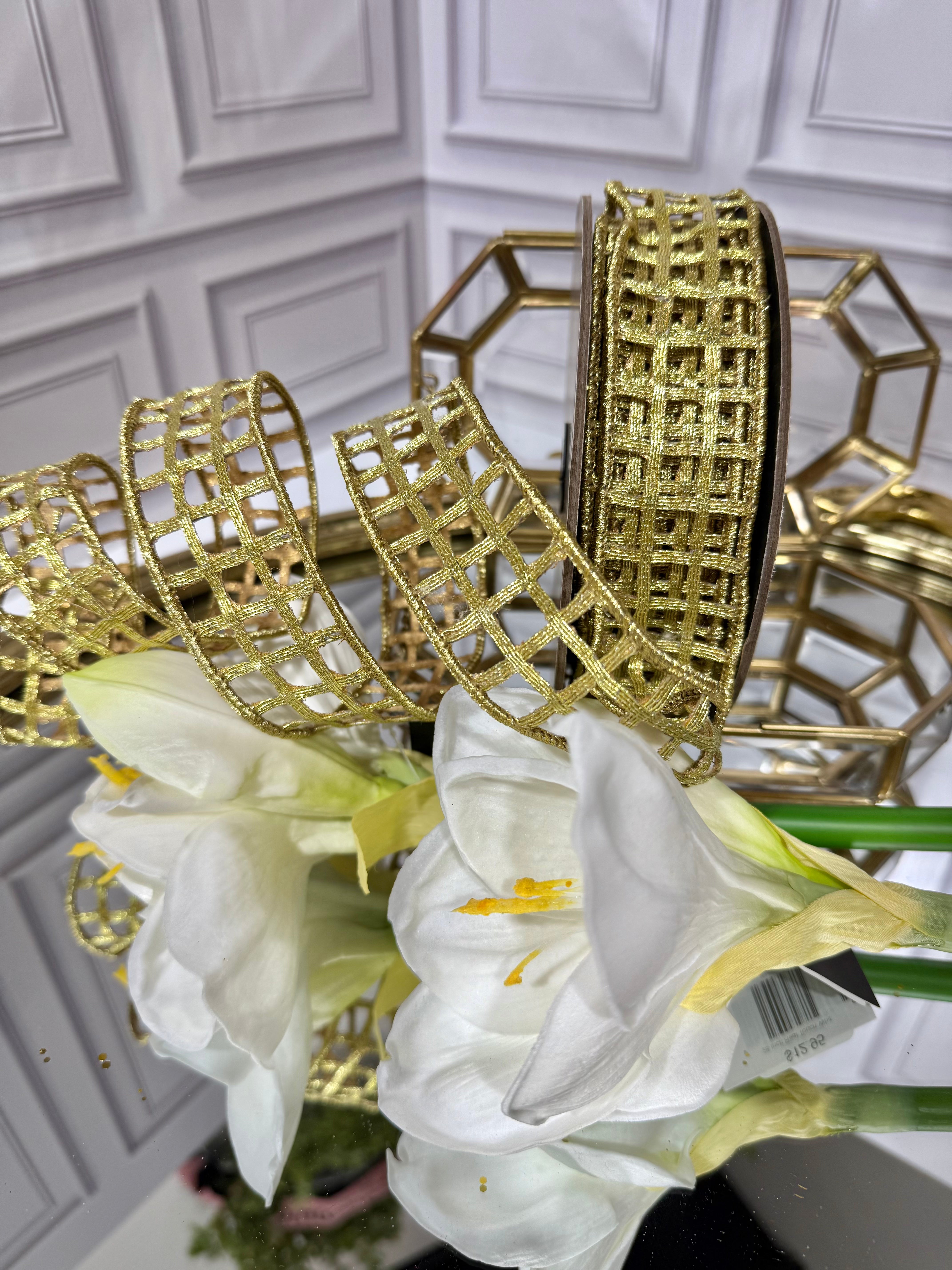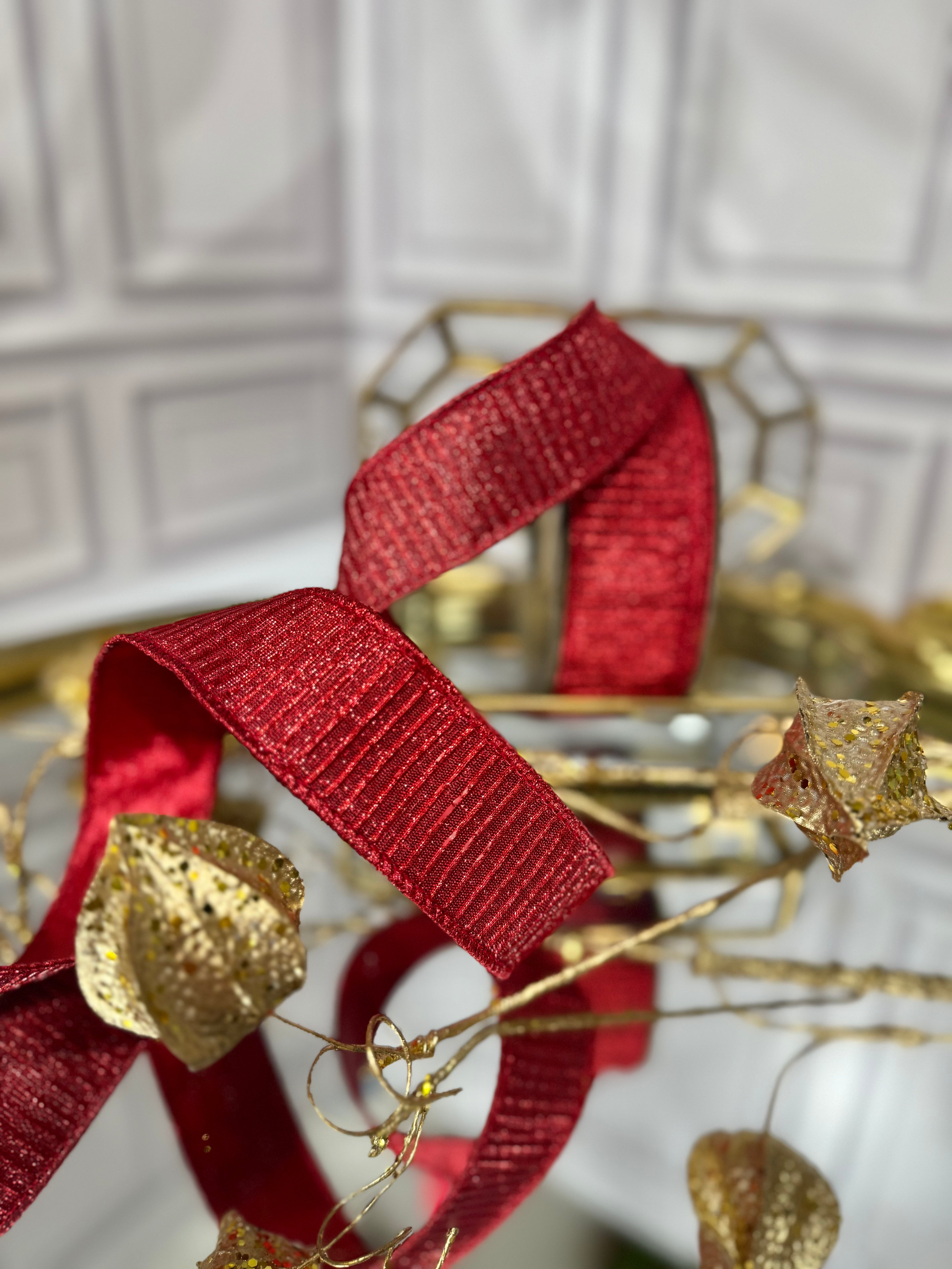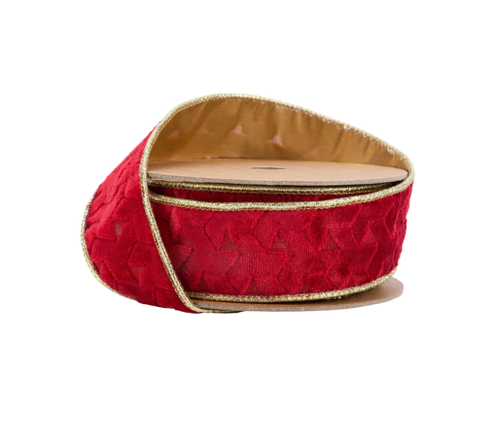 1 1/2" Wired Velvet Ribbon | Red Geometic Embossed with Gold Backing | 10 Yard Roll