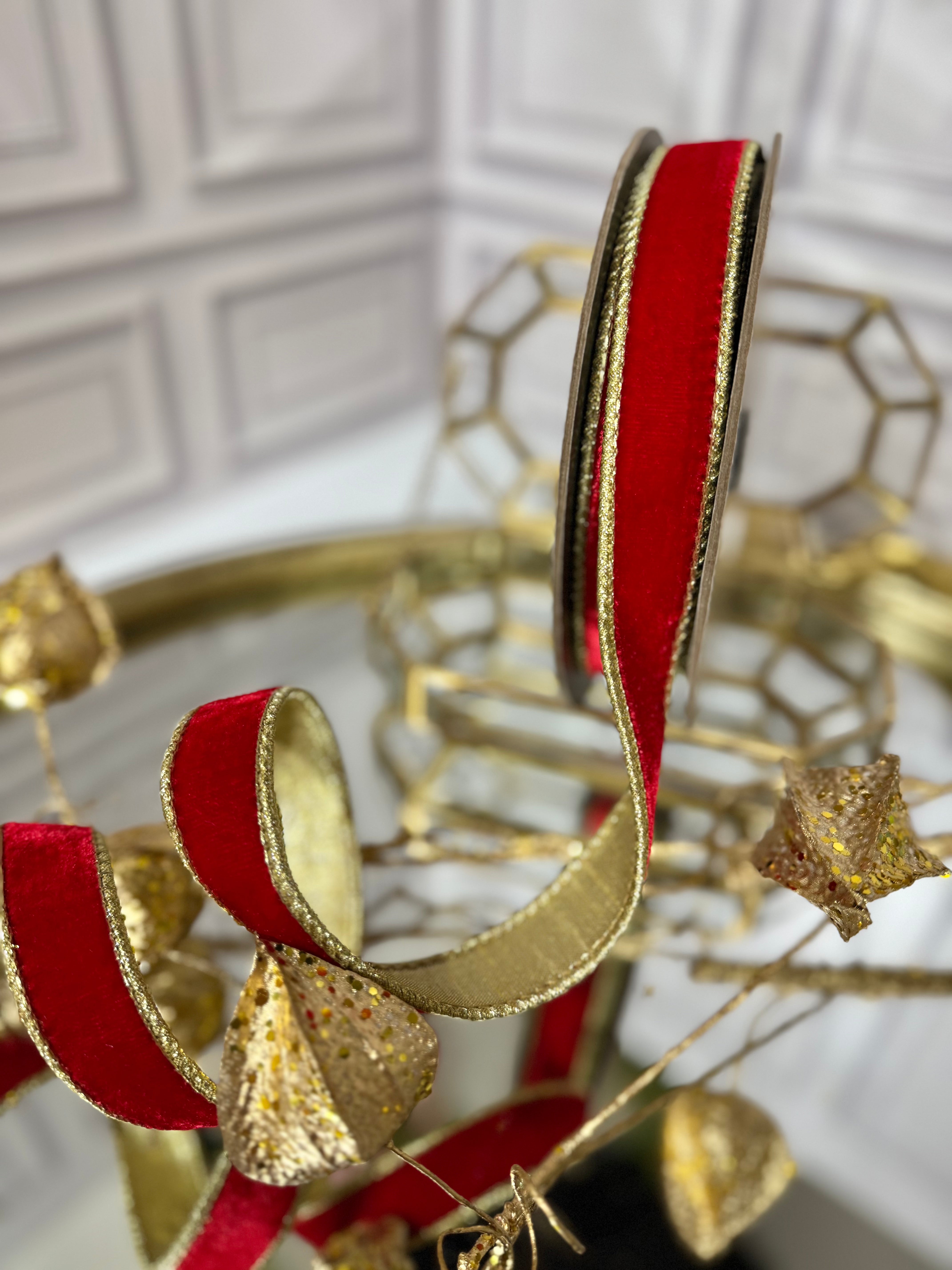 1 1/2" Double-Fused Wired Velvet Ribbon w/ Metallic Trim | Red/Gold | 10 Yard Roll