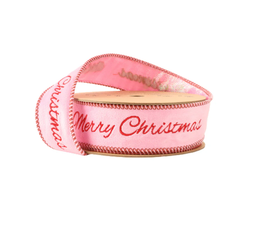 1 1/2" Embroidery Velvet | Merry Christmas w/ Pink Backing | 5 Yard Roll