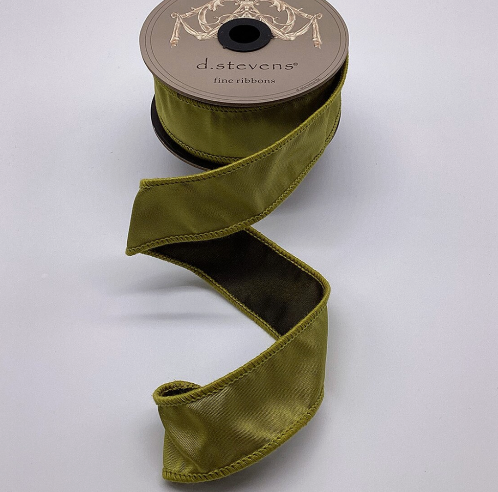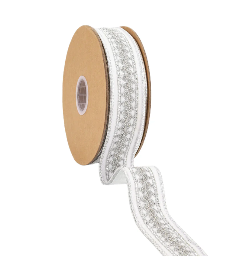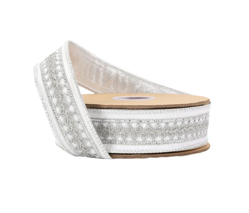 1 1/2" Double-Fused Wired Velvet Ribbon w/ Metallic Trim | White/Silver | 10 Yard Roll