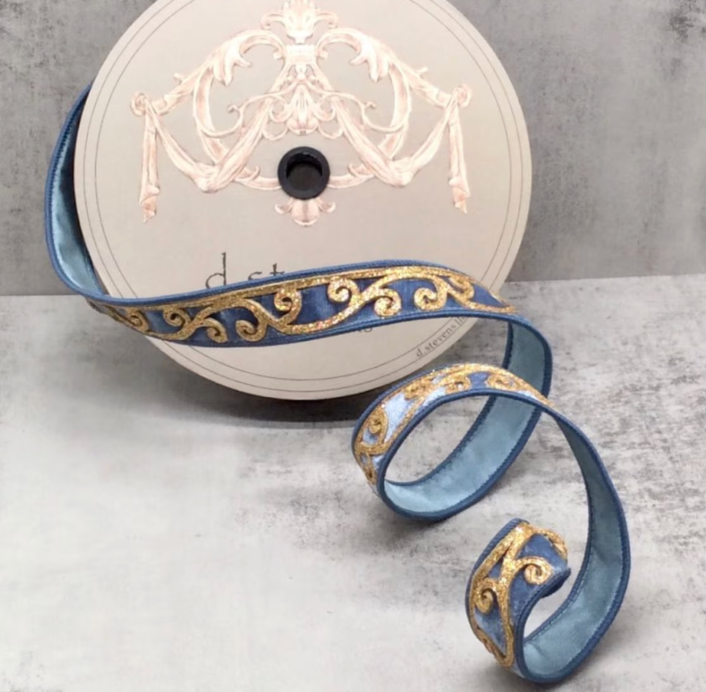 1" Dusty Blue Velvet Gold Glitter Scroll Trim