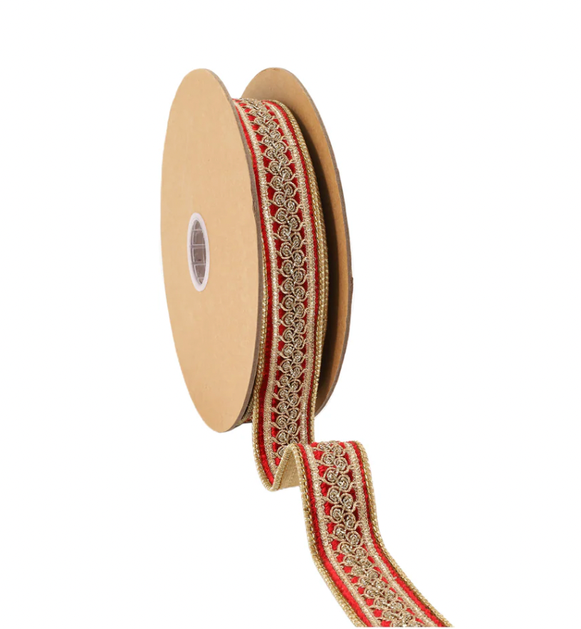 1 1/2" Double-Fused Wired Velvet Ribbon w/ Metallic Trim | Red/Gold | 10 Yard Roll