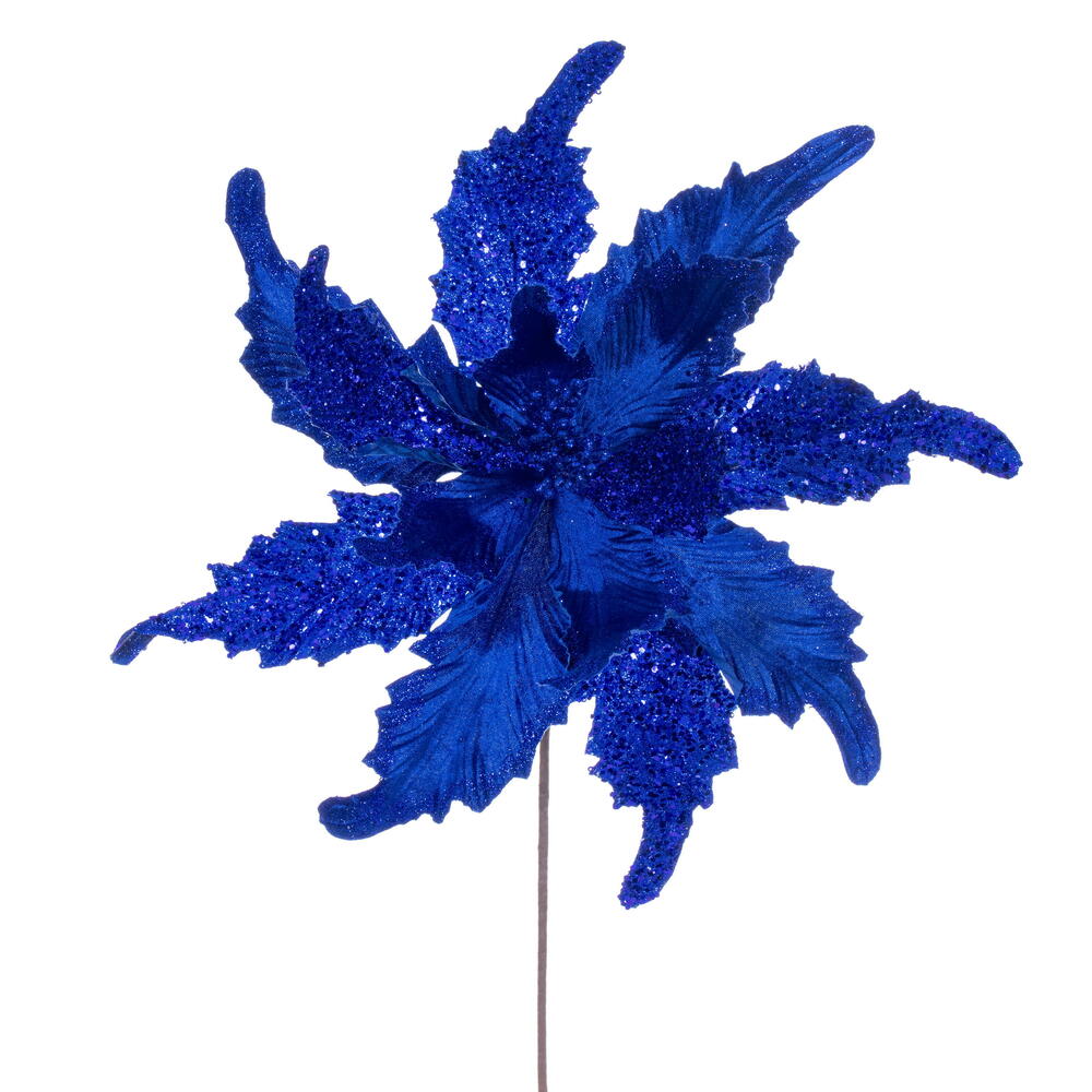 18" x 20" Blue Grand Velvet Poinsettia Stem. Each poinsettia features velvet material with glitter accents, wired petals, and a wired paper-wrapped stem. The stem measures 20 inches and the flower head diameter is 18 inches.