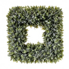 This 19" square wreath bursts with fluffy flocked boxwood charm!