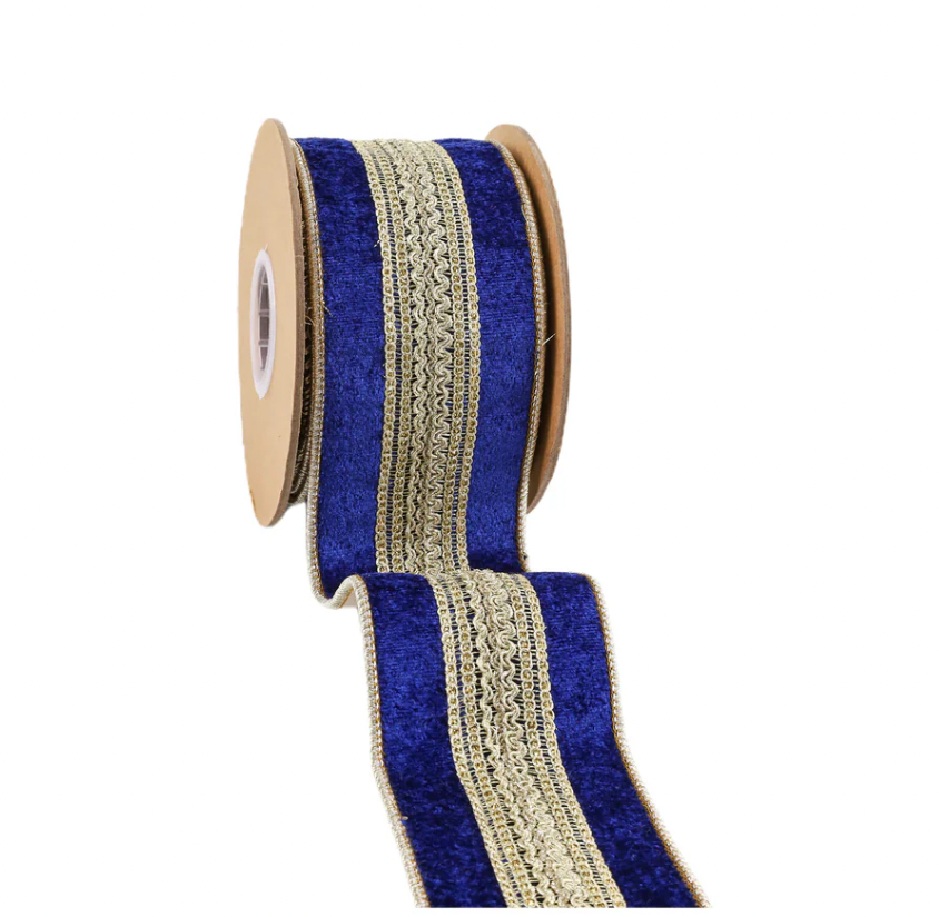 2 1/2" Wired Premium Ribbon | Gold Trim on Blue | 5 Yard Roll