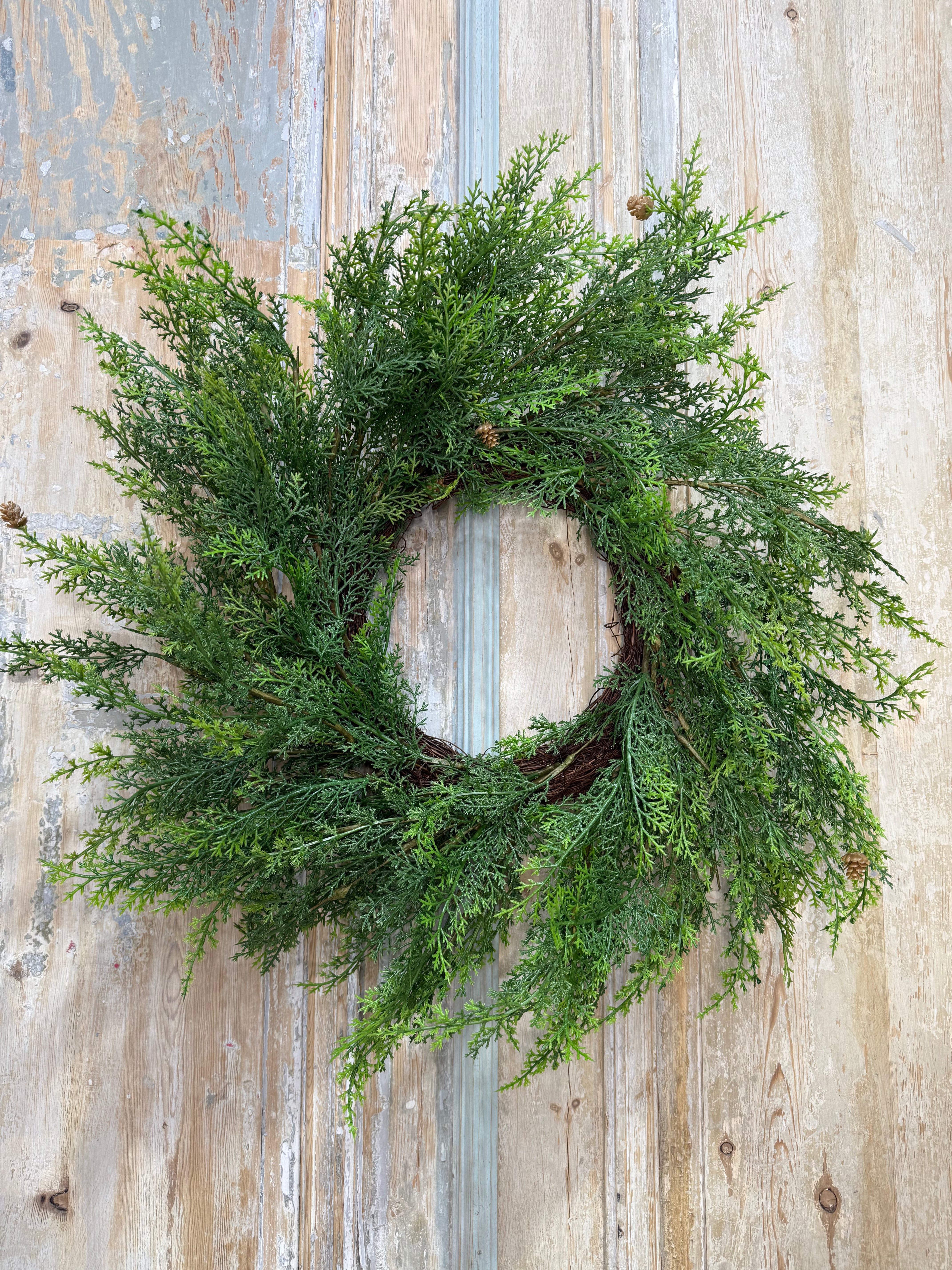 Elevate your seasonal décor with this 24-inch Cedar Pine Wreath. Crafted from lifelike faux greenery, it offers a timeless blend of cedar and pine, bringing a touch of natural elegance to any space without the upkeep of real foliage. Perfect for creating a refined ambiance on doors, walls, or mantels.