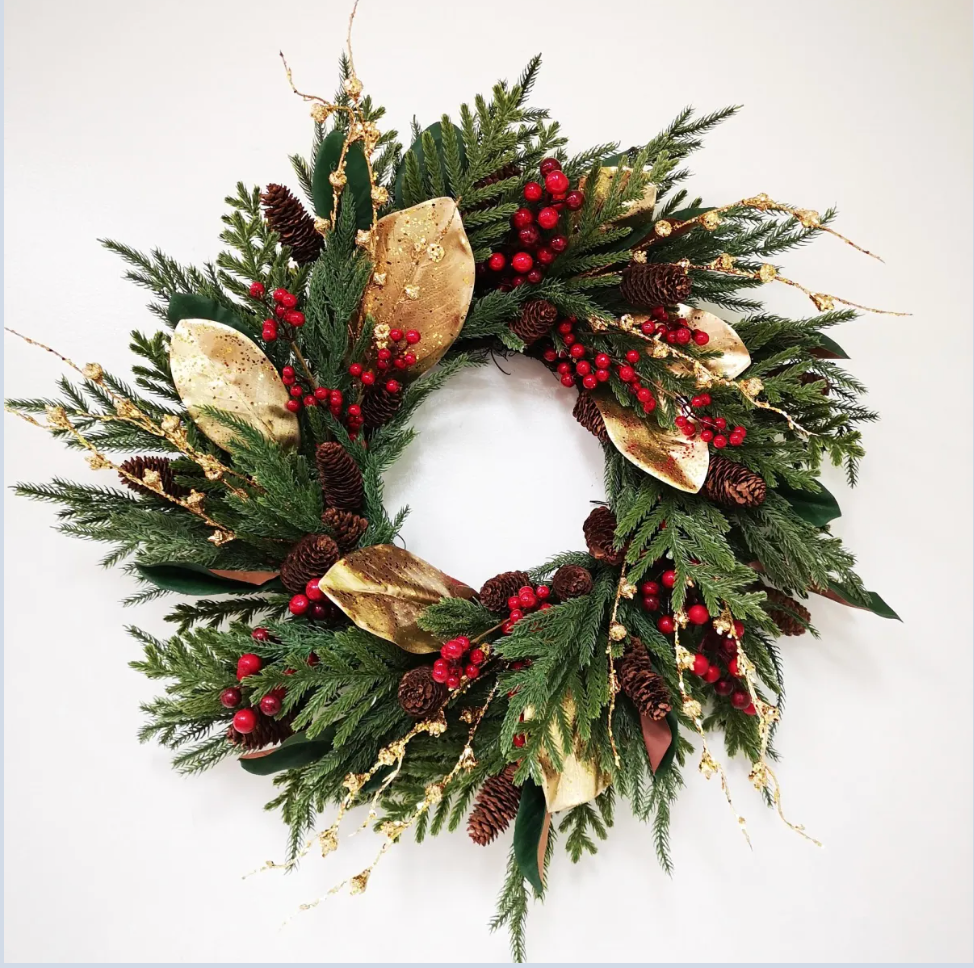 Bring timeless elegance to your space with this stunning 26" Gold Magnolia Wreath. Featuring metallic gold magnolia leaves arranged in a full, eye-catching circle, this wreath offers a luxurious touch perfect for holidays, weddings, or year-round décor. The rich golden finish adds warmth and glamour to doors, mantels, or event displays. Whether you're creating a festive focal point or a sophisticated everyday accent, this wreath makes a bold and beautiful statement.