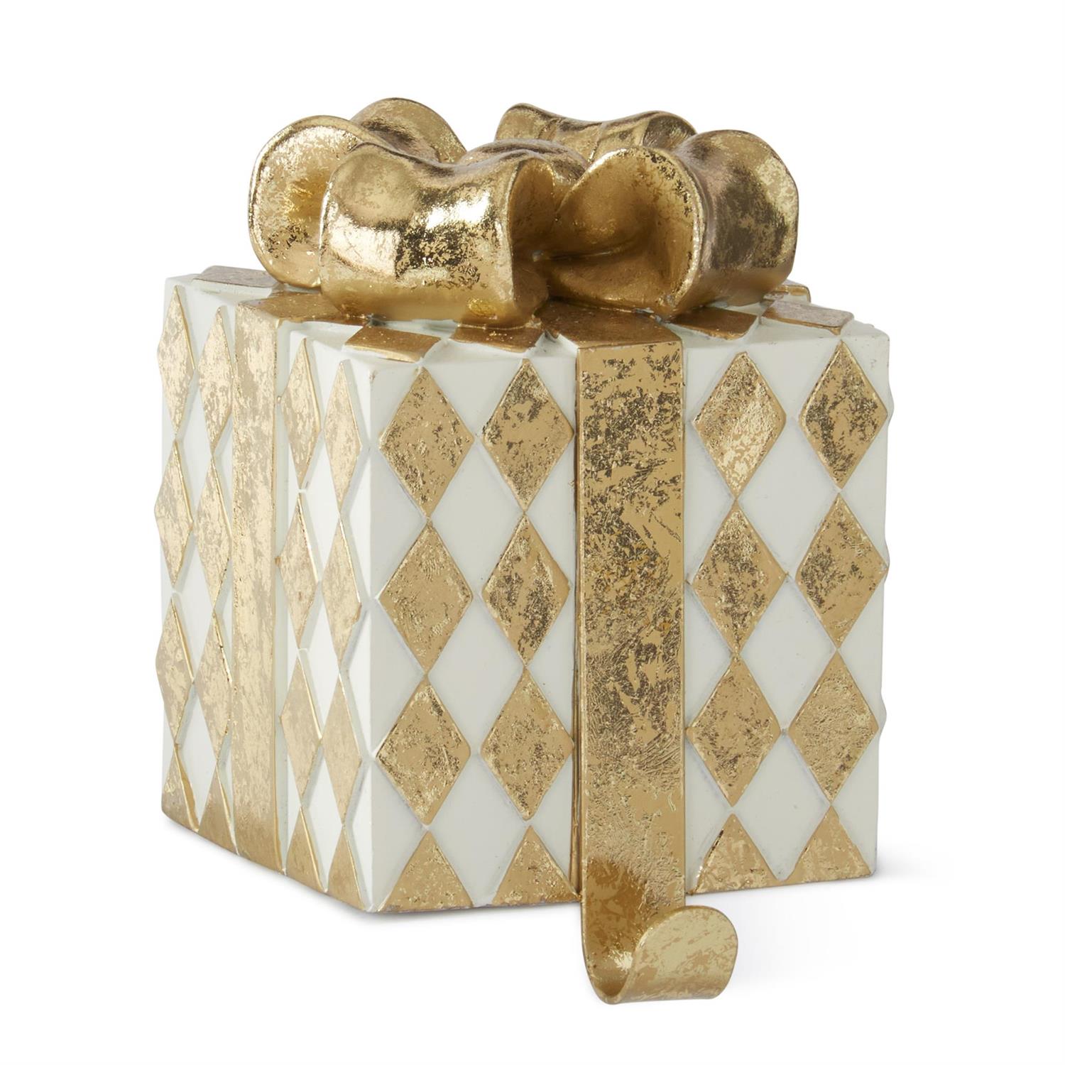 Add a touch of festive fun to your holiday décor with this 5.5-inch Gold & White Gift Resin Stocking Holder. Its charming design keeps your stockings snugly in place while adding a sparkly pop of holiday cheer. Perfect for holding your stockings in style, it’s a playful way to brighten up your mantel or shelf this season.