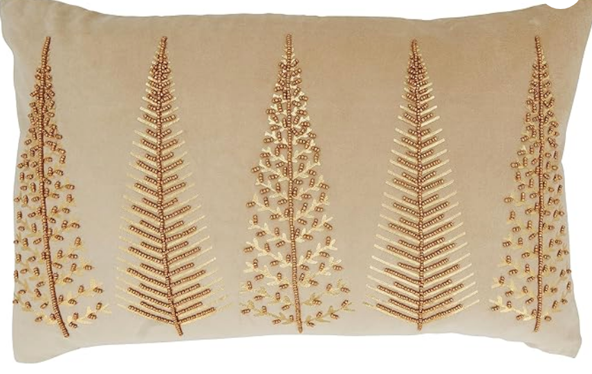 Festive gold beading Christmas Trees on beige Oblong pillow.