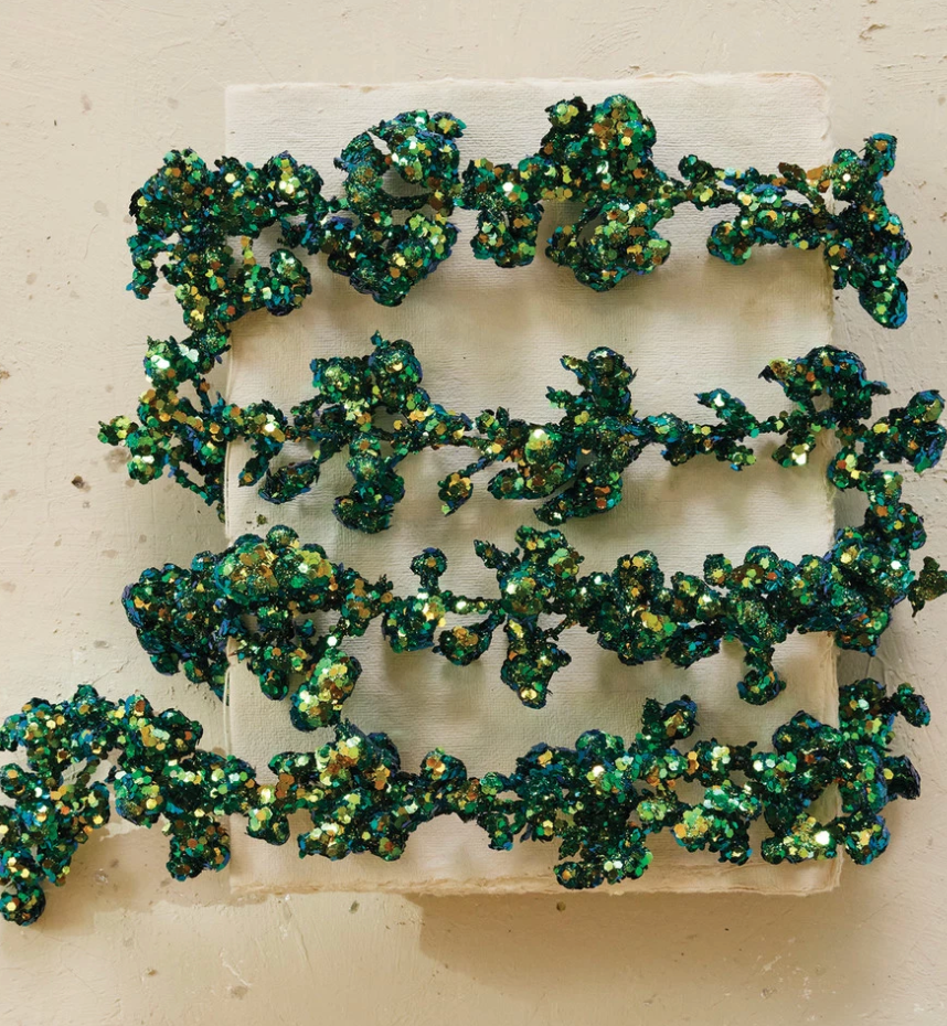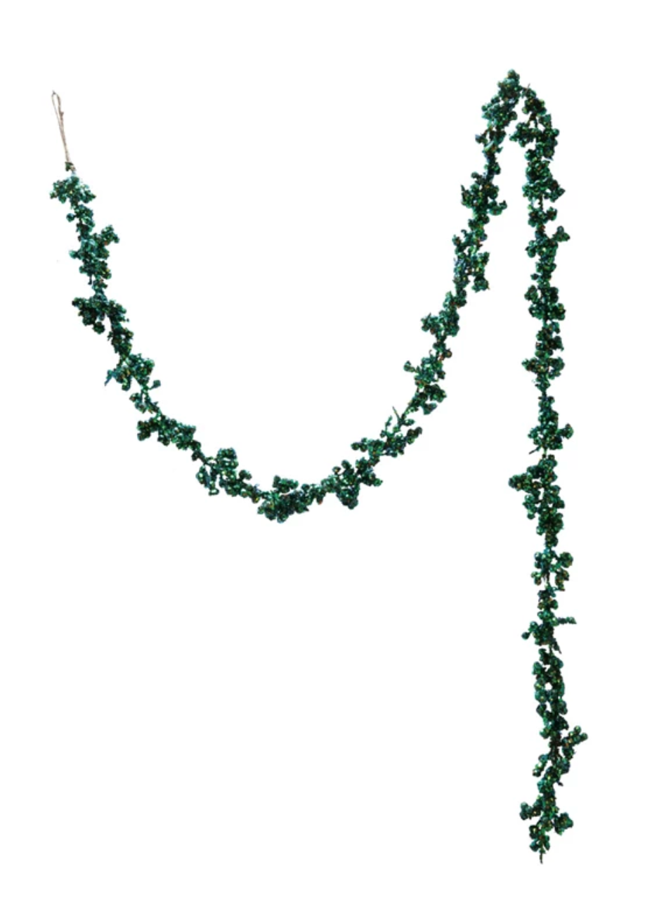 Add a shimmering touch to your holiday décor with this 72" Foam & Glitter Chunky Garland in iridescent green. Measuring 2-3/4" H, the glittered foam mounds catch the light beautifully, making it perfect for draping over mantels, staircases, tables, or wreaths. Lightweight and versatile, this garland is ideal for holiday decorating, festive parties, or creative DIY décor projects.