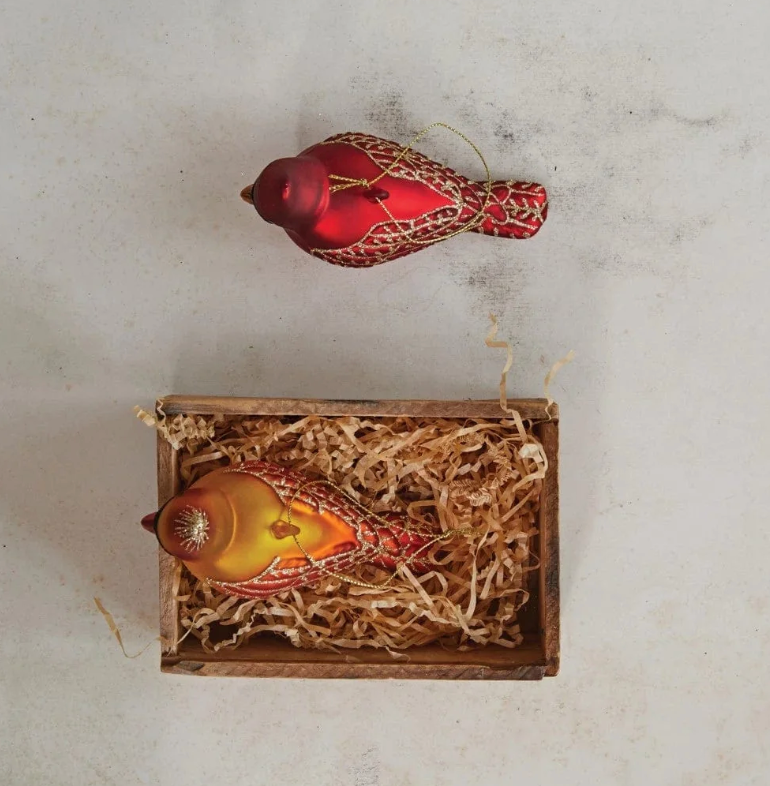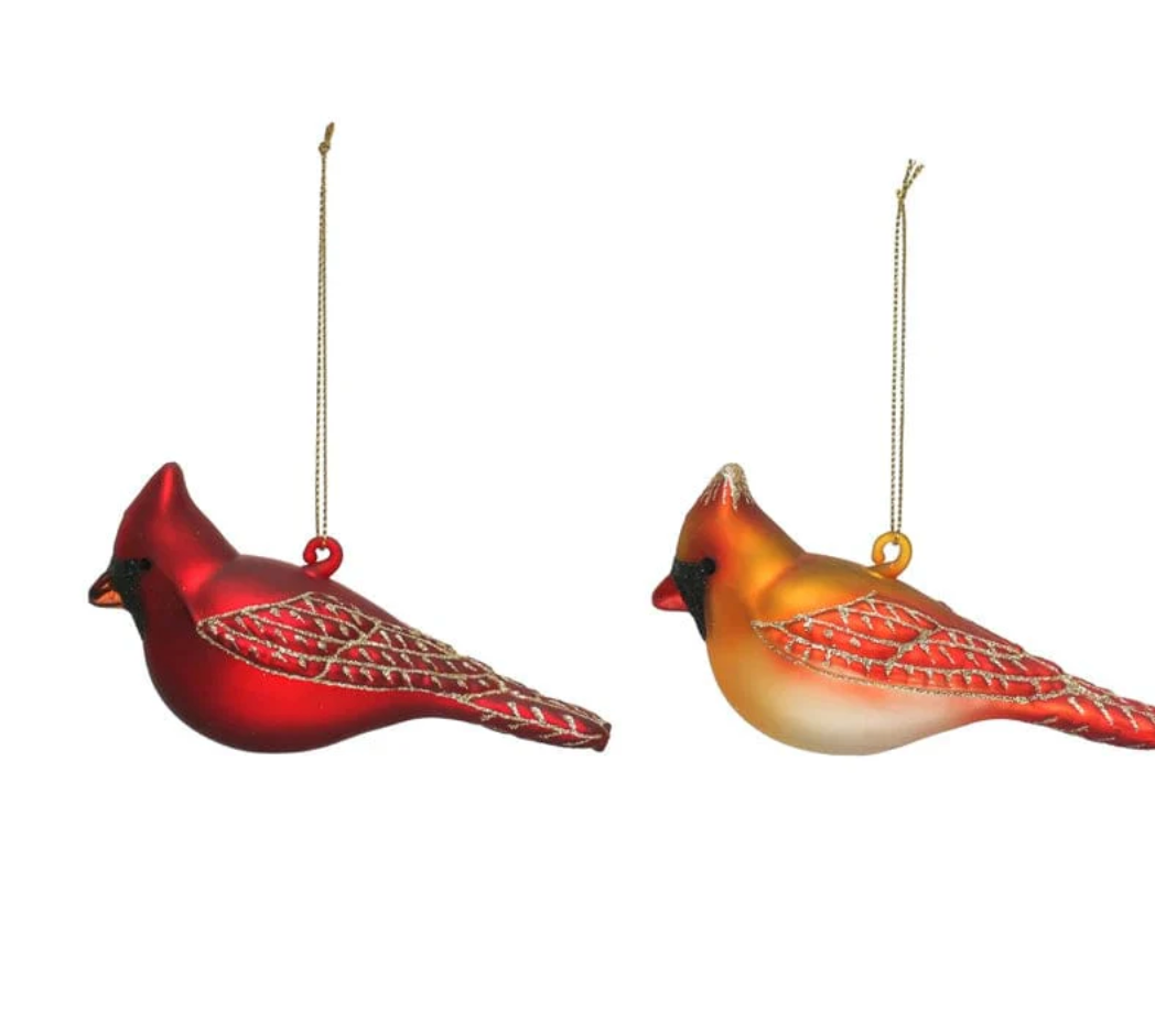 Bring a touch of holiday cheer to your home with this Hand-Painted Glass Cardinal Ornament. Measuring 5" L x 2" H, each ornament is crafted from glass, hand-painted, and accented with sparkling glitter for a festive finish. Available in two vibrant colors—Red and Orange—these charming cardinals are perfect for hanging on your tree, adorning a mantel, or adding a pop of color to your holiday décor. Each bird is sold separately, allowing you to mix and match to create a beautiful seasonal display.