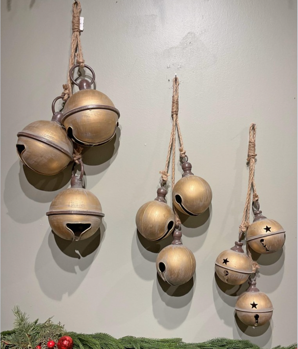 Add festive cheer to your holiday décor with this Hanging Gold Jinglebell Cluster, featuring three oversized metallic gold bells suspended from a rustic rope. The shimmering finish adds a warm, elegant touch, perfect for doorways, mantels, wreaths, or porch displays. Whether hung alone or grouped in varying sizes, these bells bring vintage charm and seasonal sparkle to any space.