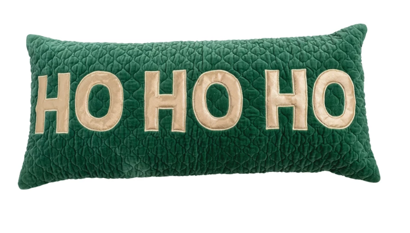 Bring festive cheer to your home décor with this Woven Cotton Velvet Quilted Lumbar Pillow featuring an appliqued "HO HO HO" design. Measuring 36" L x 16" H, the green and gold color palette adds a warm, elegant touch to sofas, beds, or holiday seating areas. Soft, textured velvet and quilted detailing provide both comfort and style, making this pillow a perfect Christmas accent or thoughtful gift for loved ones.