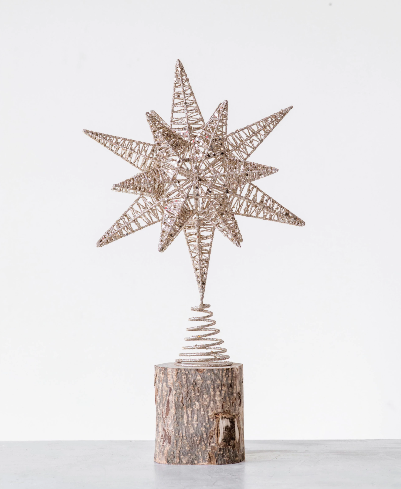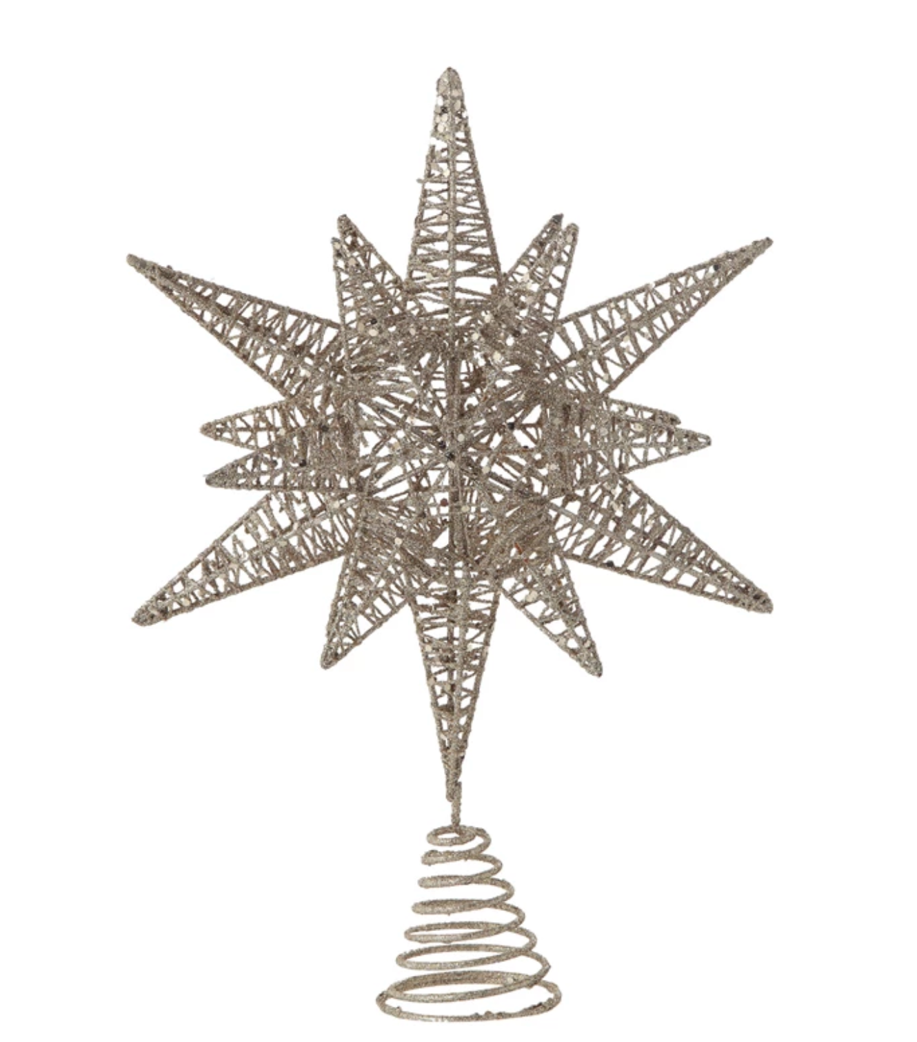 Complete your Christmas tree with this dazzling Metal Star Tree Topper with Glitter. Measuring 10-1/2" L x 4" W x 15-1/2" H, this eye-catching topper adds sparkle and elegance to the top of your tree. Crafted from durable metal and finished with glitter for extra shimmer, it serves as the perfect finishing touch. Pair with coordinating ornaments or decorations to create a cohesive and festive look throughout your tree.