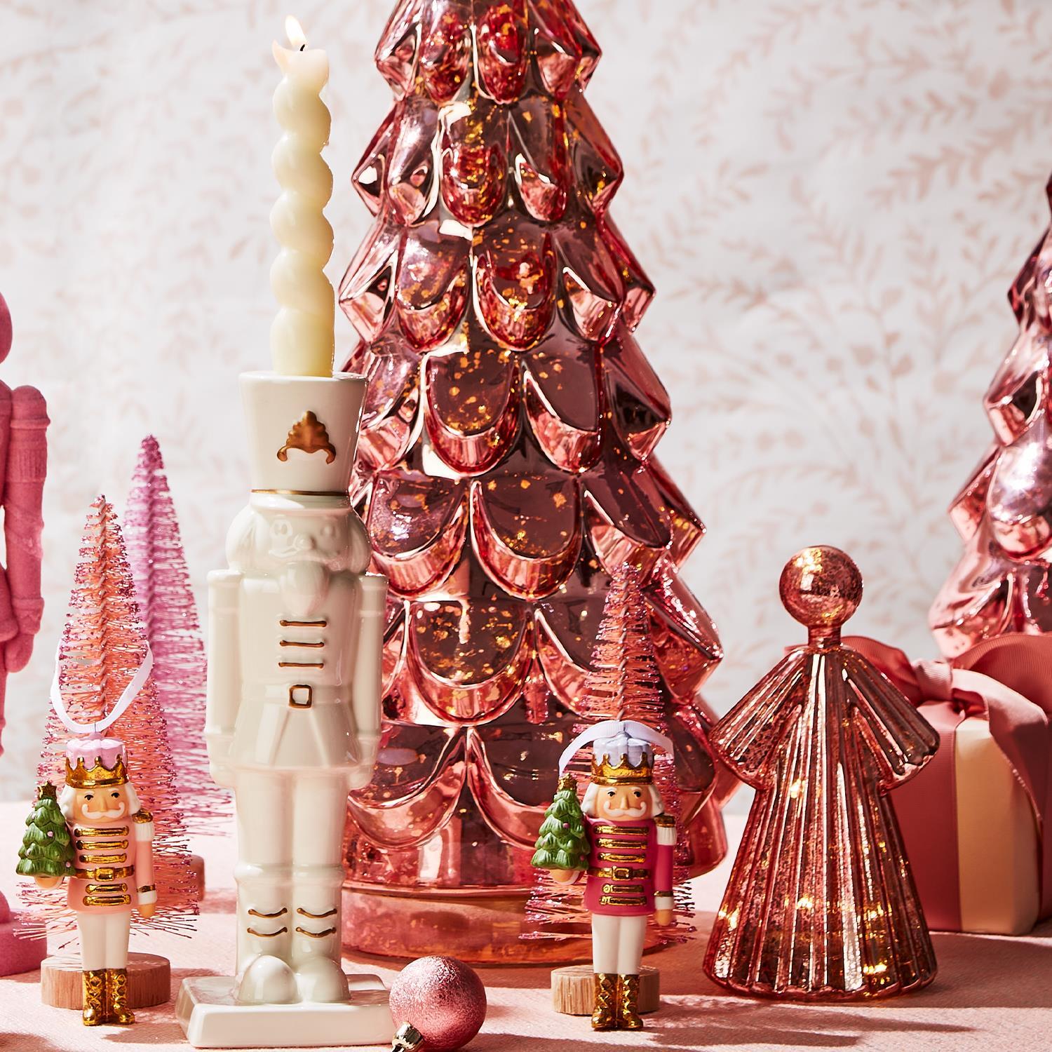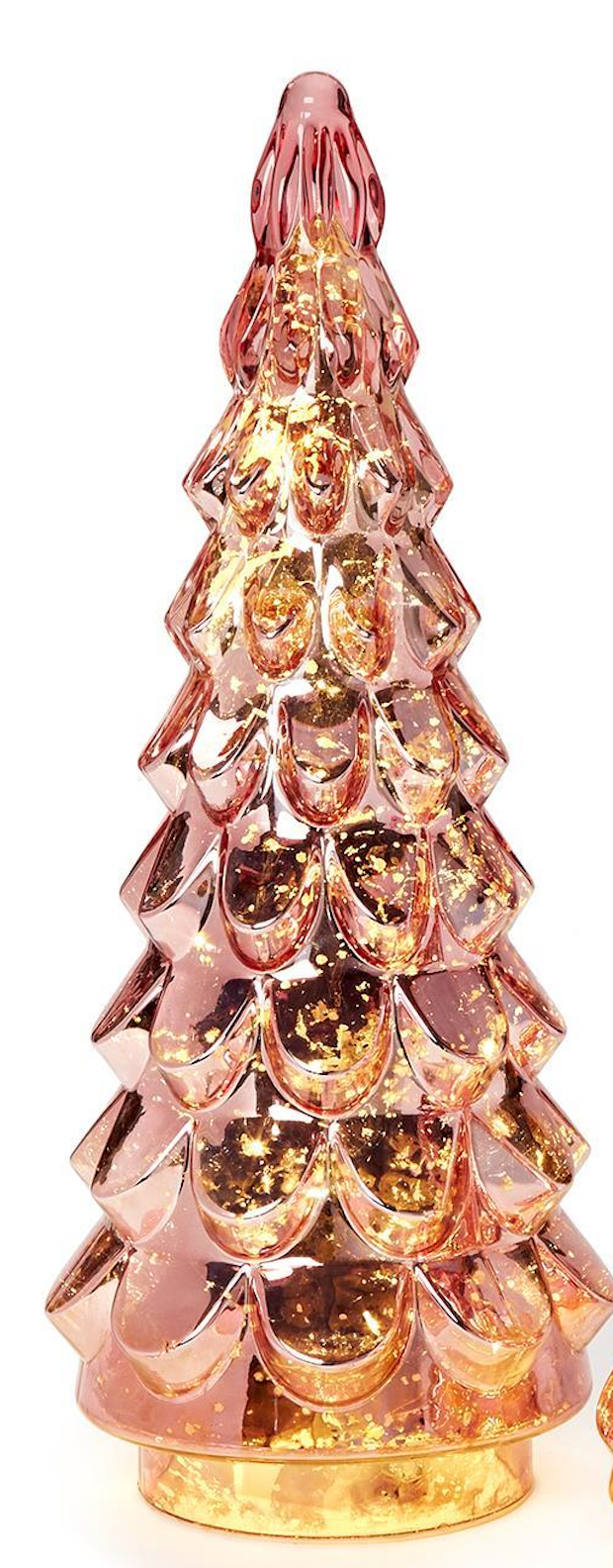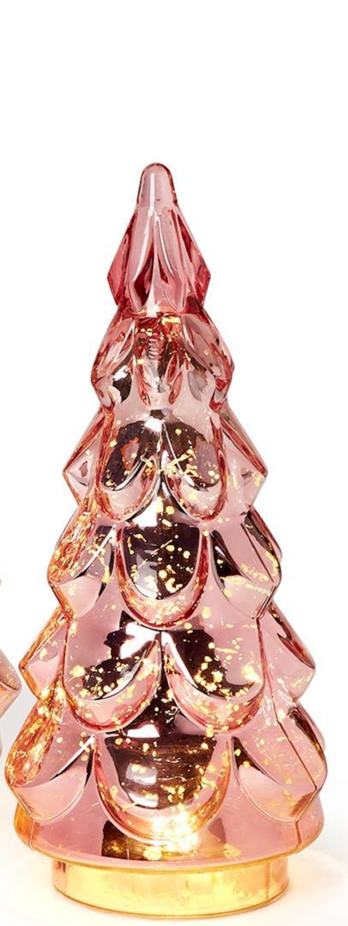 Pink Mercury Glass Finish Light-Up LED Christmas Trees bring a fresh, playful twist to holiday décor. Available in two sizes and sold separately, the soft metallic pink mercury glass adds elegance while giving a modern update to traditional holiday colors. LED lights create a sparkling effect, perfect for adding warmth and shimmer to any space.