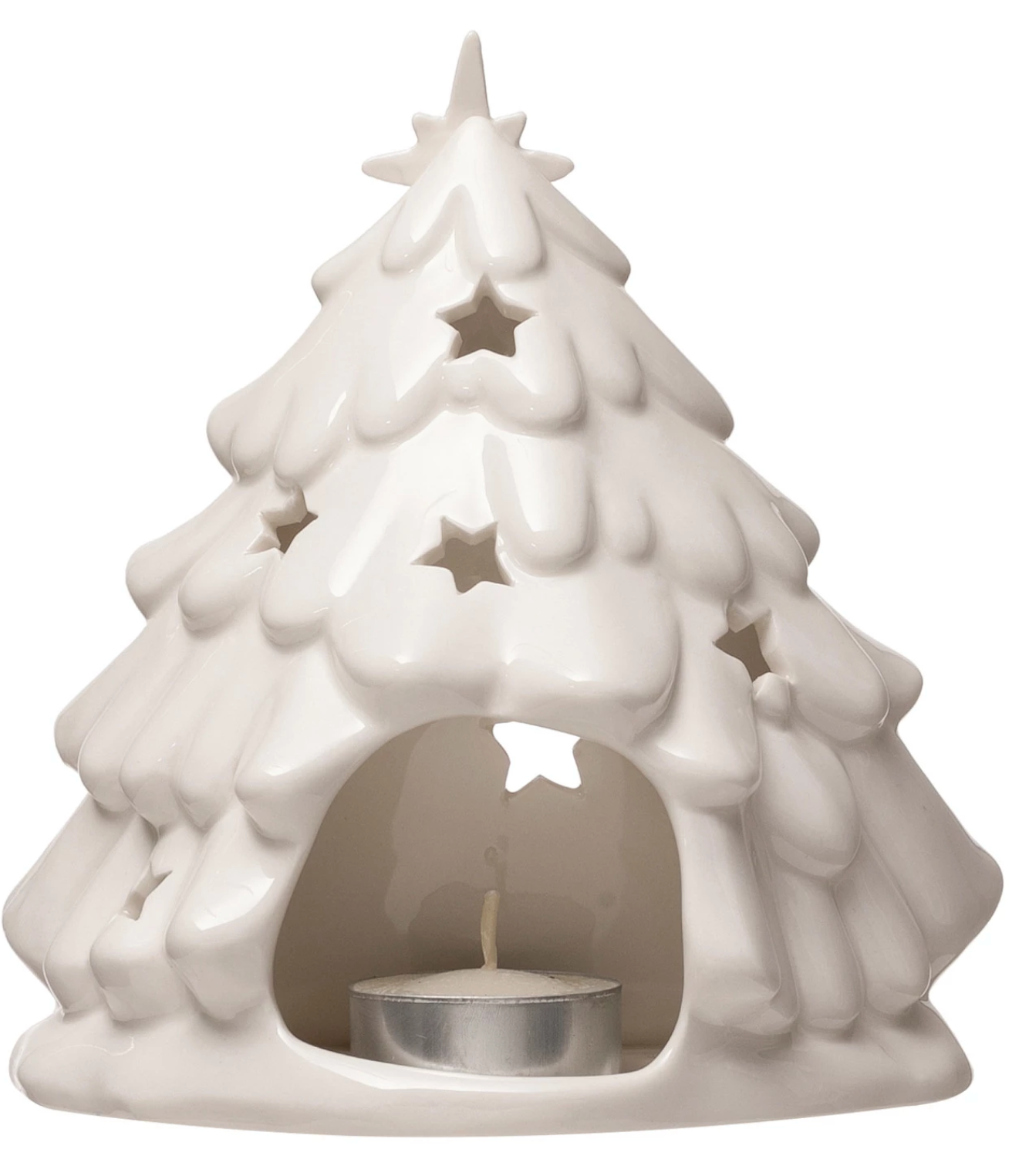 Add a touch of traditional holiday charm to your home with this Stoneware Christmas Tree Candle Holder featuring the Holy Family. Crafted from durable stoneware, this 5-3/4" L x 4" W x 5-3/4" H piece showcases a beautifully sculpted Christmas tree design with the Holy Family at its center. Its neutral white color allows it to blend seamlessly with any décor while standing out as a unique and meaningful holiday accent. Perfect for displaying a candle or as a centerpiece in your festive décor.