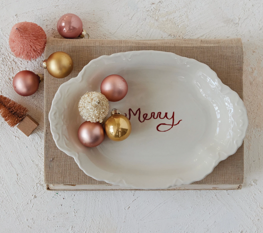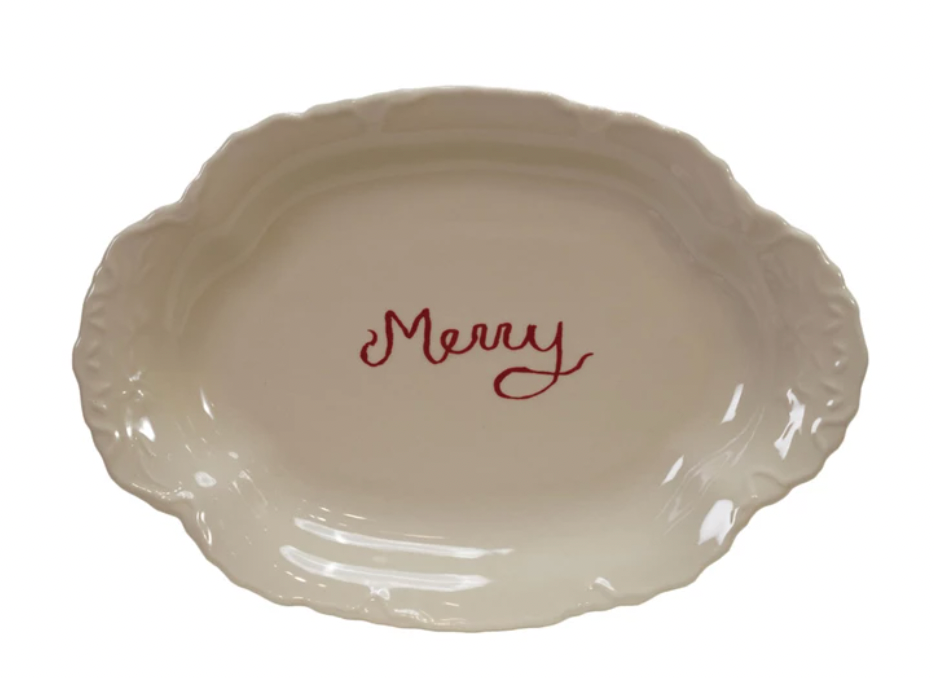 Stoneware Scalloped Platter with Embossed Edge "Merry"