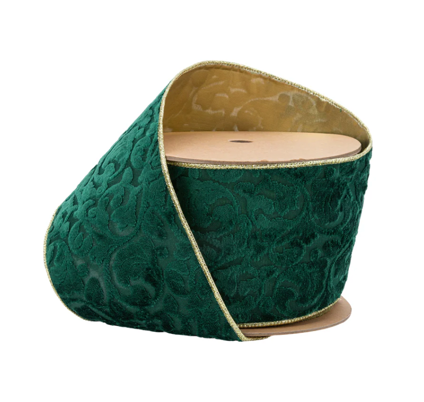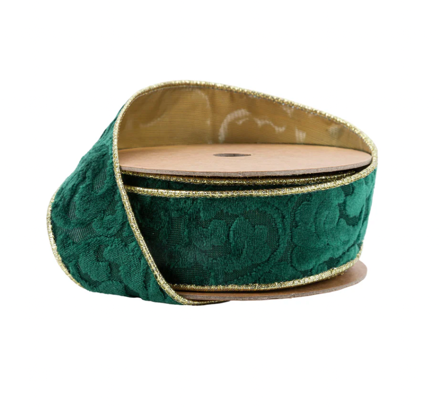 Wired Reversible Velvet Ribbon | Green Floral Embossed with Gold Backing | 10 Yard Roll