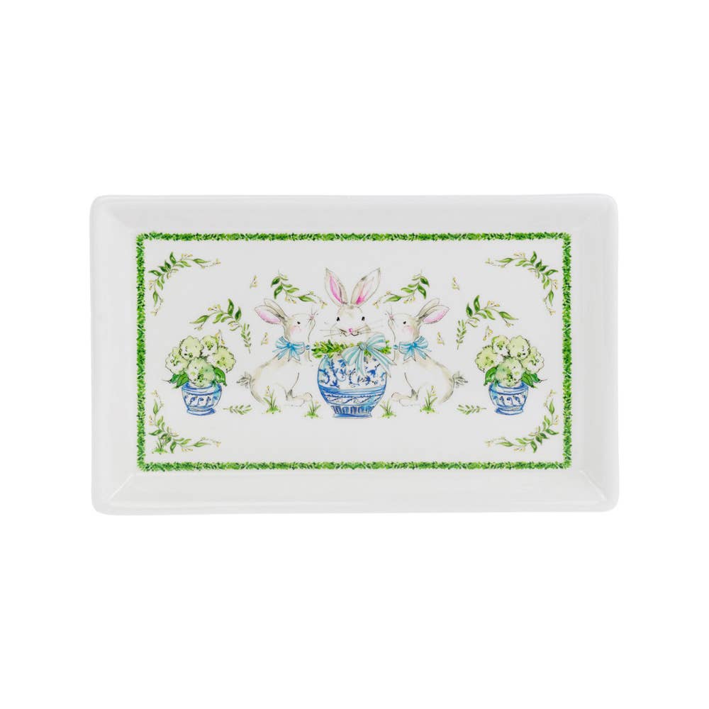 9.75" Boxwood Bunny Rectangle Ceramic Plate Rosanne Beck, 9.75" L x 6" W x 1" H -- Colors: White, Green, Blue, Pink (Spring Garden Delight) This beautiful rectangle plate features charming illustrations of bunnies and greenery, perfect for adding a touch of whimsy to your springtime gatherings. The delicate use of green leaves and blue pots brings a fresh, garden-inspired motif to your table setting. Detailed with adorable bunnies and vibrant florals, this plate embodies a cheerful and elegant spring garden theme.