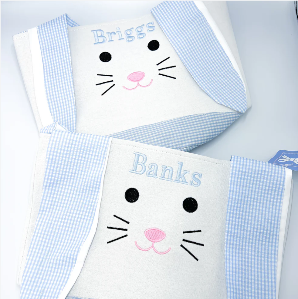 Celebrate the magic of springtime with a seersucker-trimmed Bunny Basket made for egg-hunting, Sunday morning surprises, and all of the excitement that the holiday has in store. With bunny ear straps and sweet bunny face embroidery, these large cotton totes are constructed of soft stone canvas and pastel seersucker and can be customized with a name or monogram for that extra special added detail.