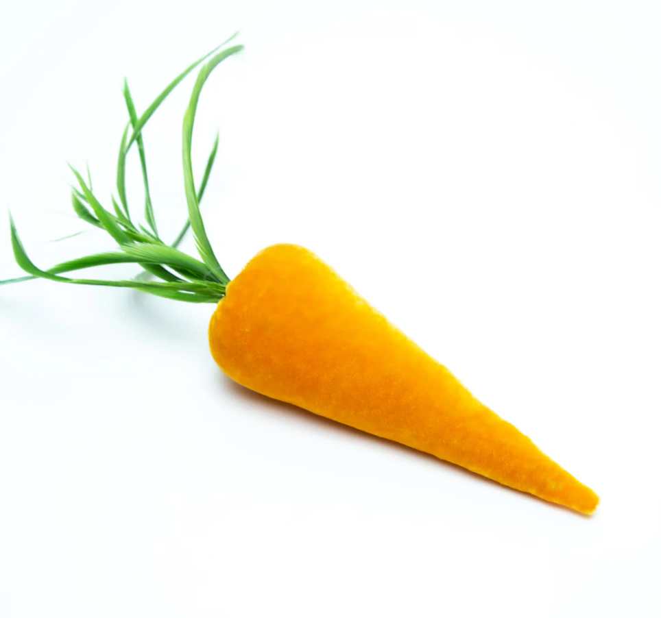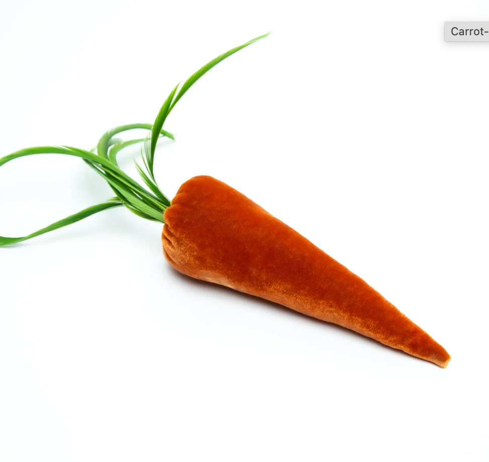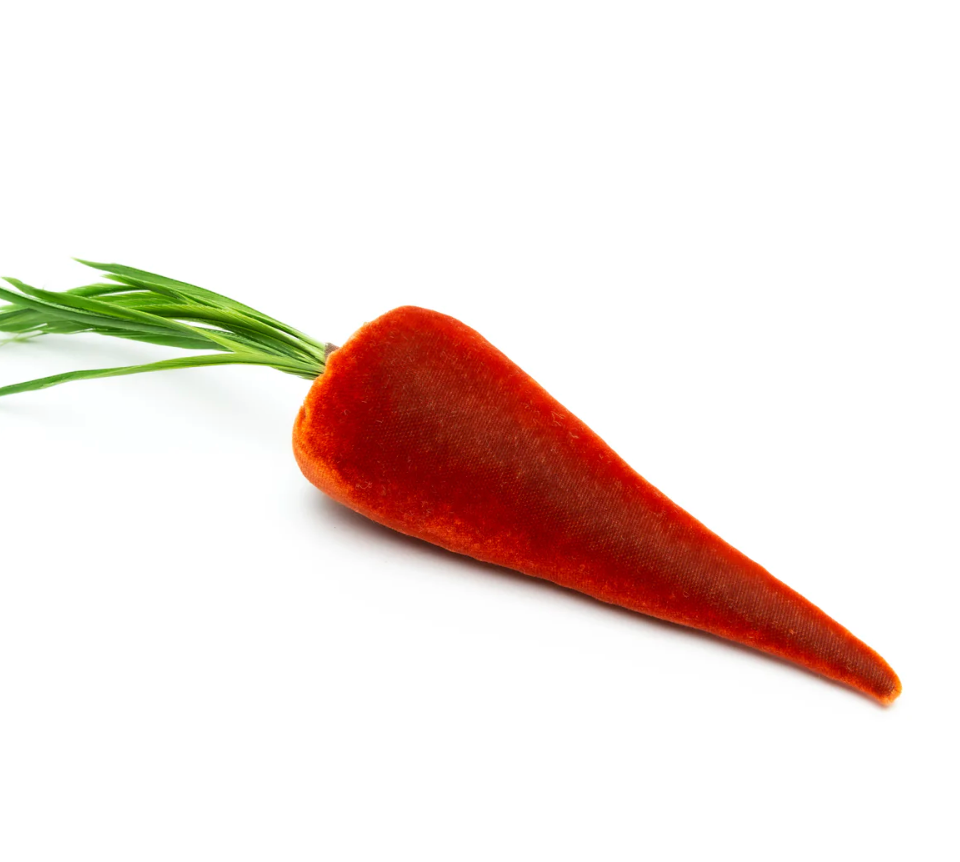 These sleek chic silk velvet carrots are handmade in Oregon by a trained artisans. Each piece is hand cut and sewn to order and finished with a spectacularly cut and curled feather Plume. Always in season for every home.