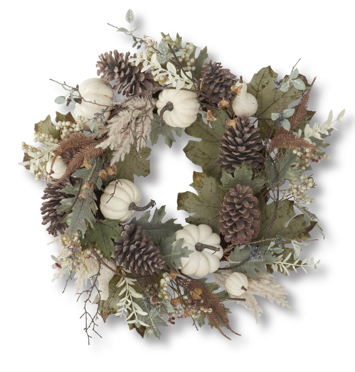 28 Inch Mixed Fall Foliage Wreath with White Pumpkins & Pinecones