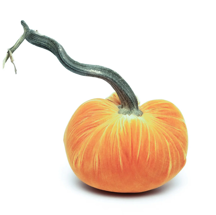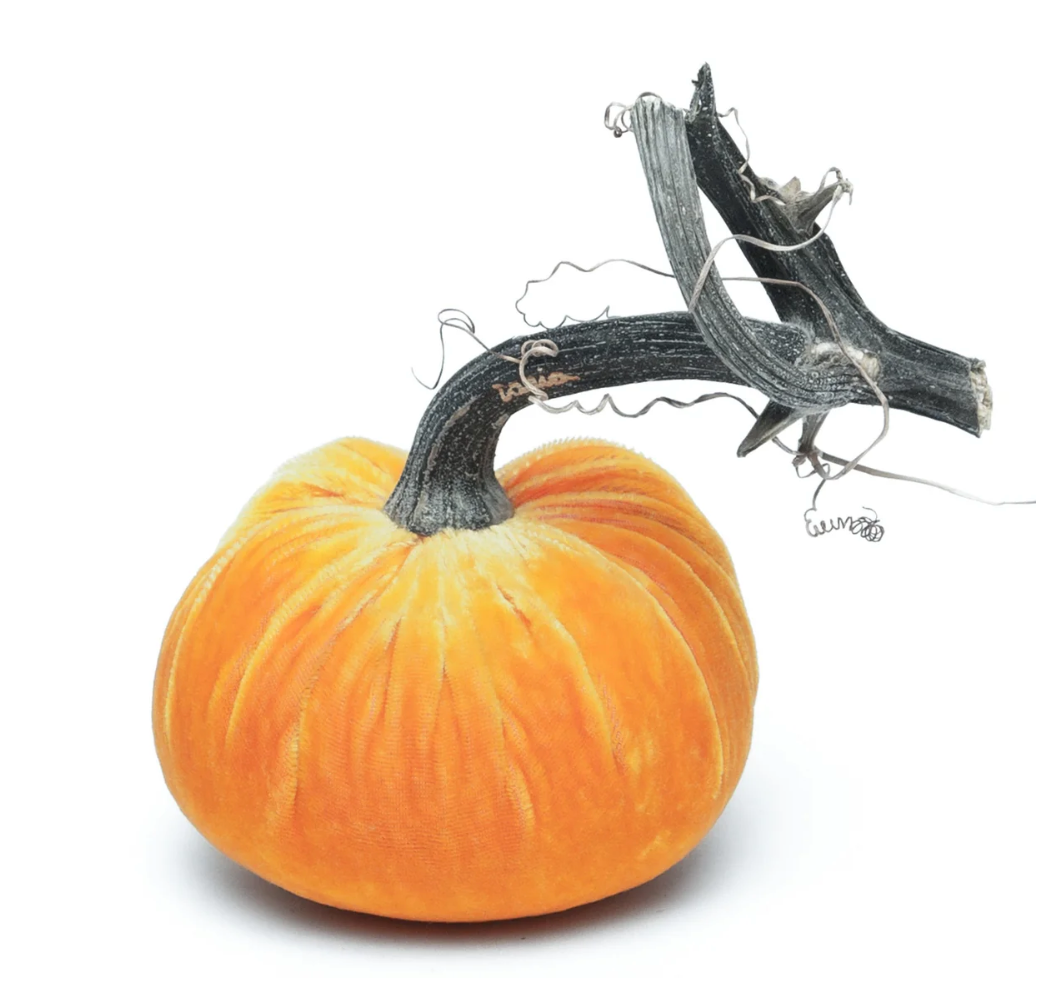 Hot Skwash silk velvet pumpkins are handmade in Oregon by one of our trained artisans. Each piece is hand cut and sewn to order and finished with a natural stem. Our stems are specially curated varieties to ensure beautiful shapes and quality. They are all signed in gold with Daria's signature giving it our authentic Hot Skwash touch.