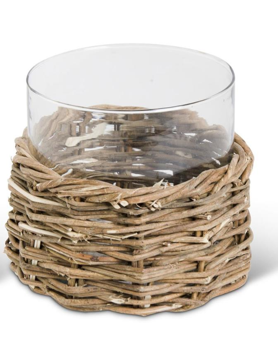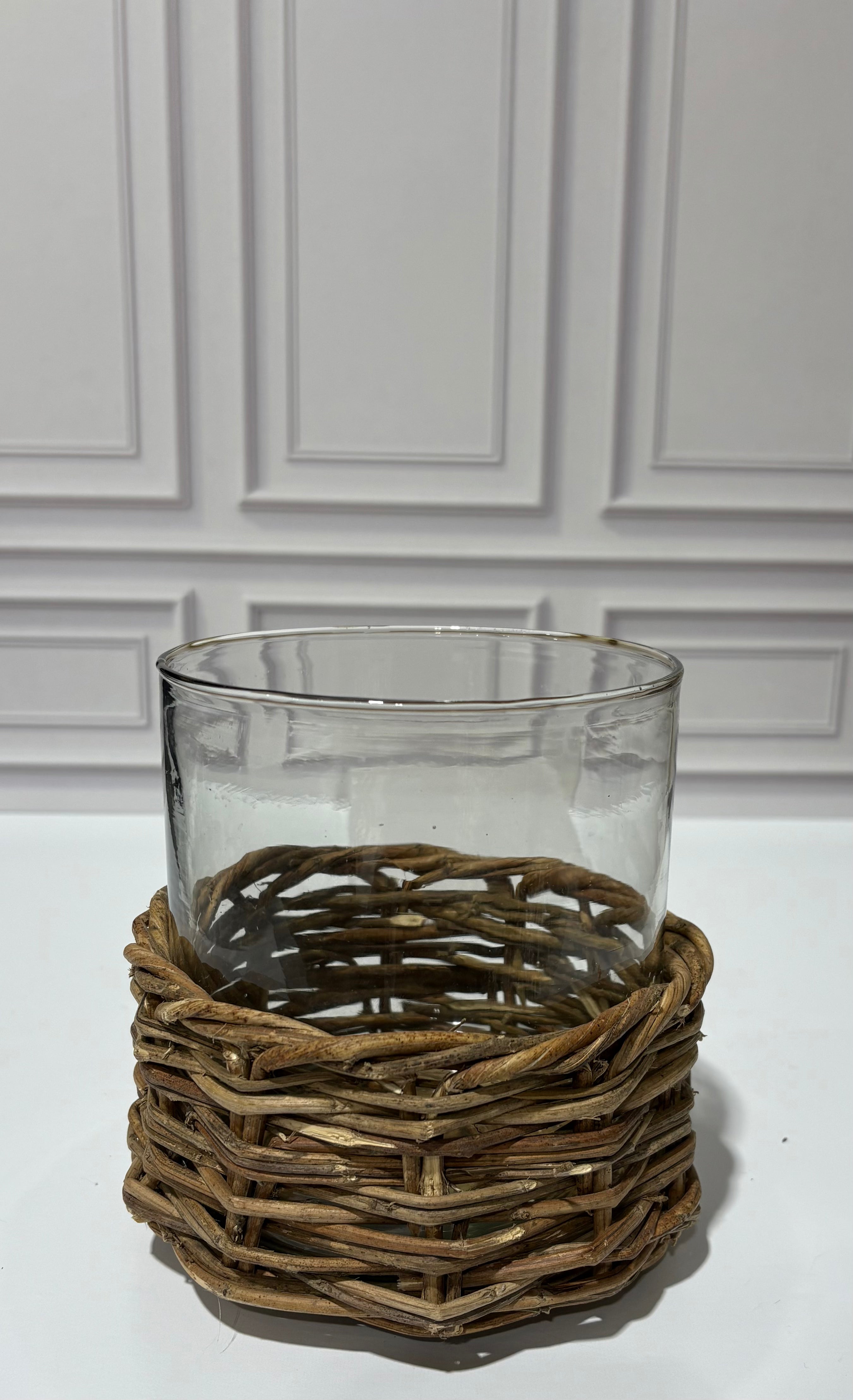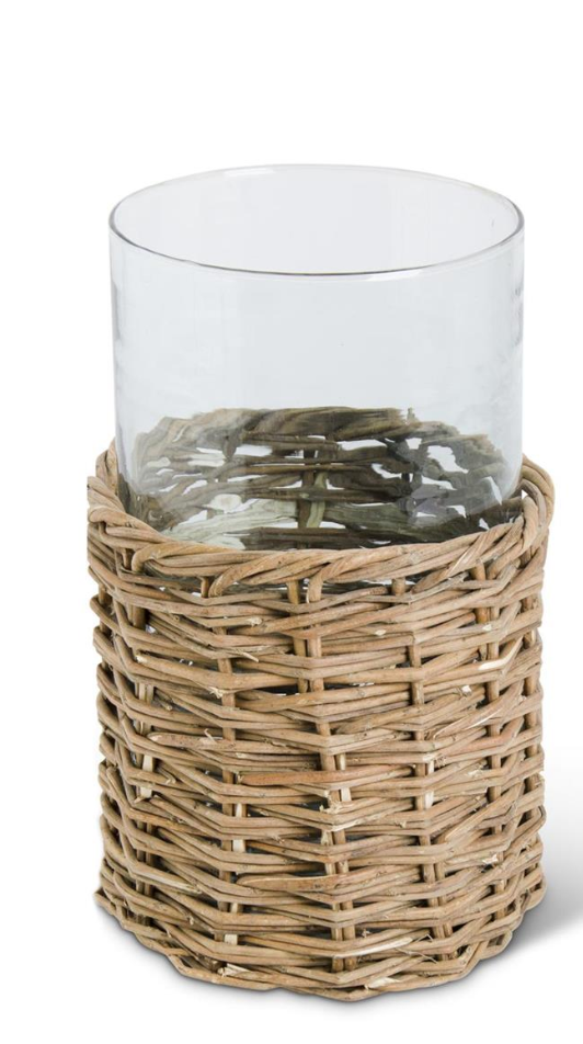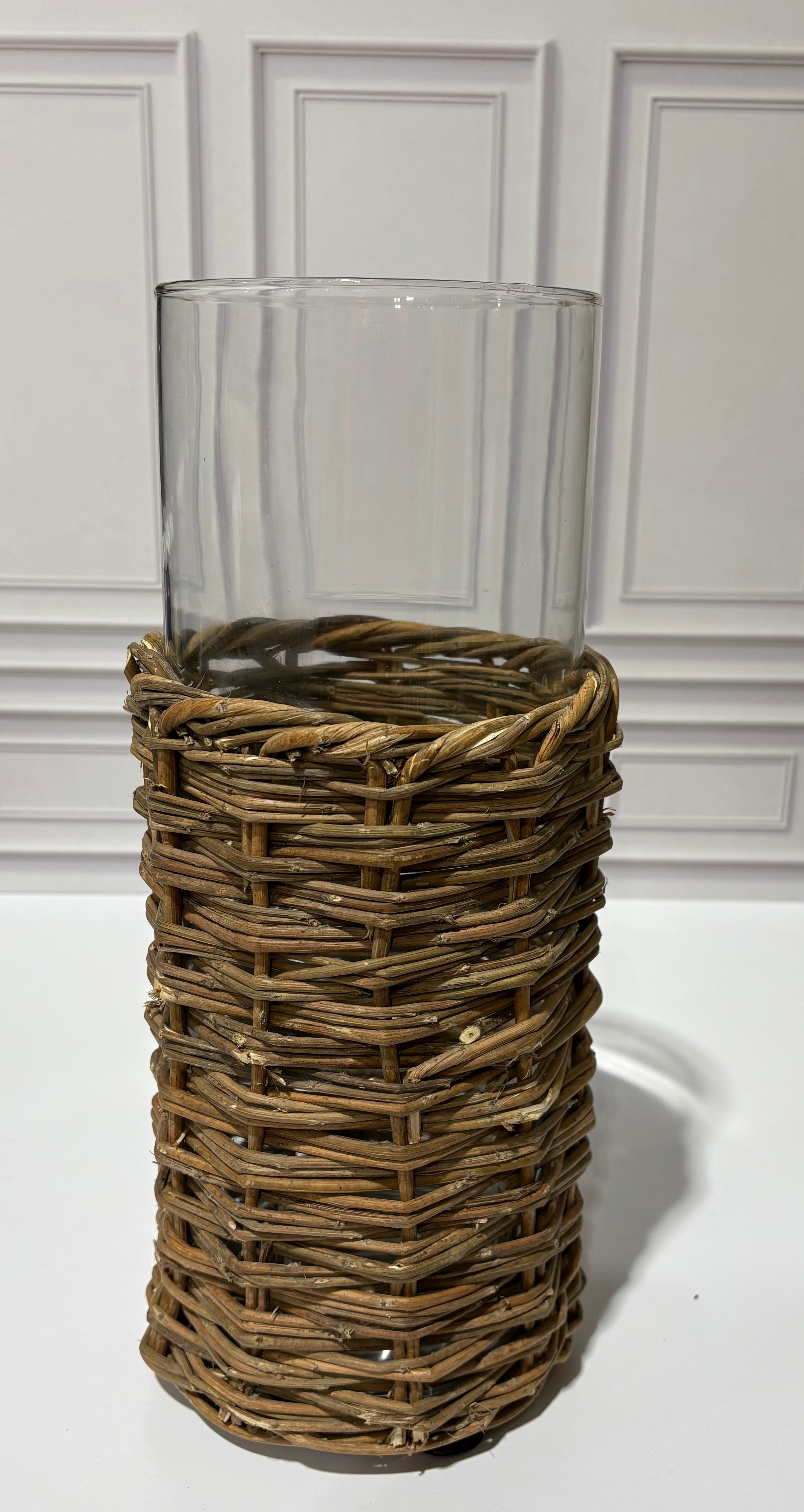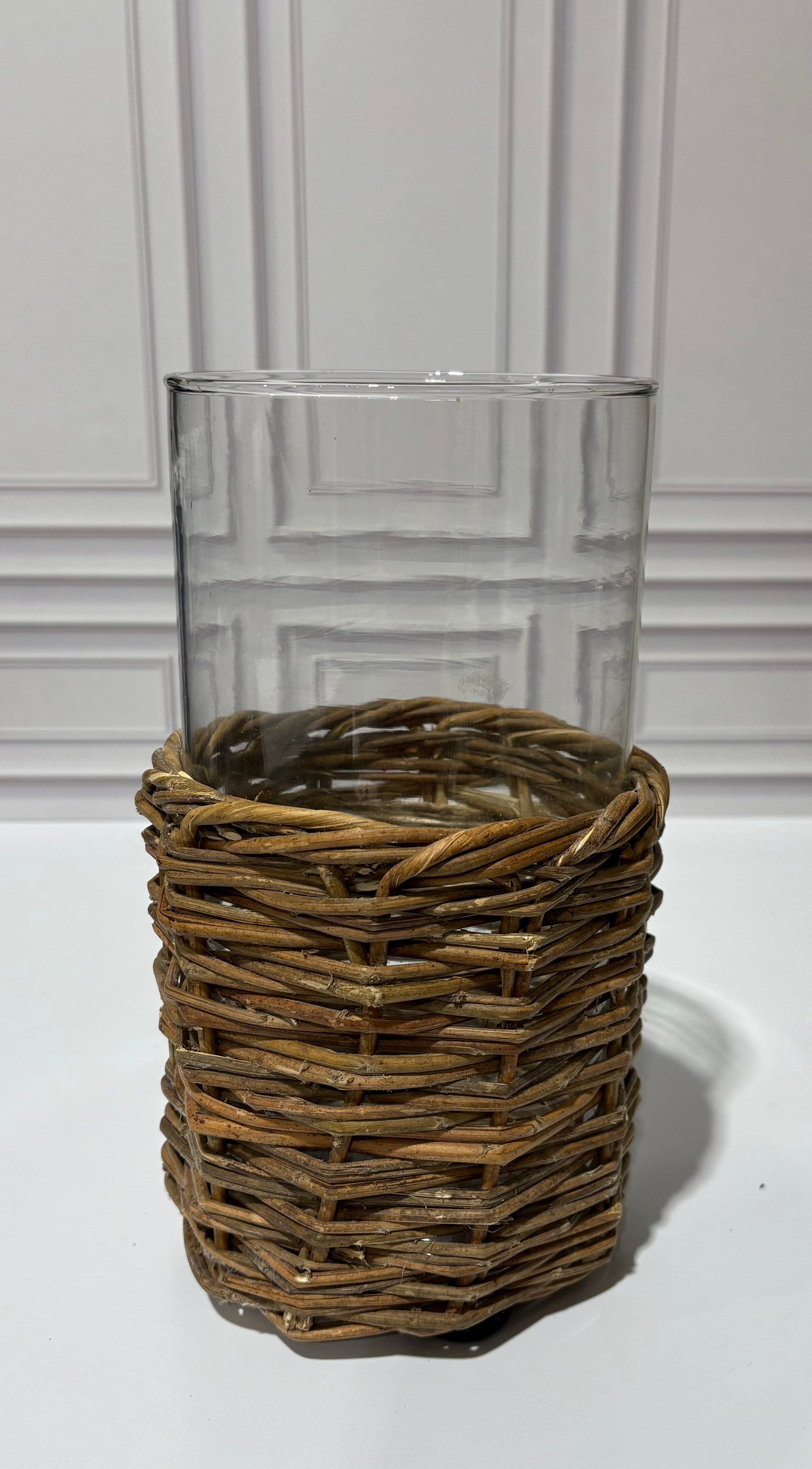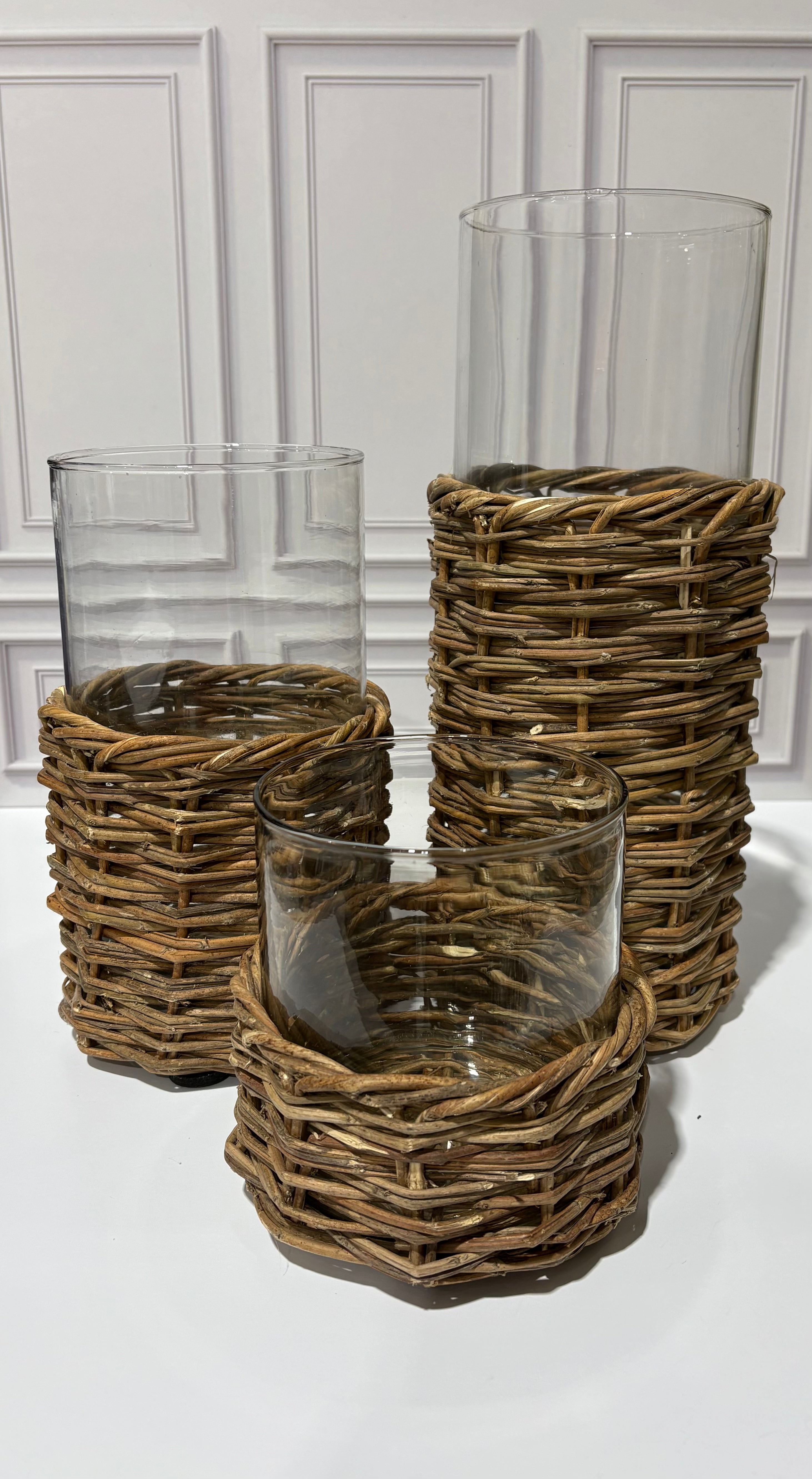 Clear Glass Cylinders in Woven Rattan Baskets