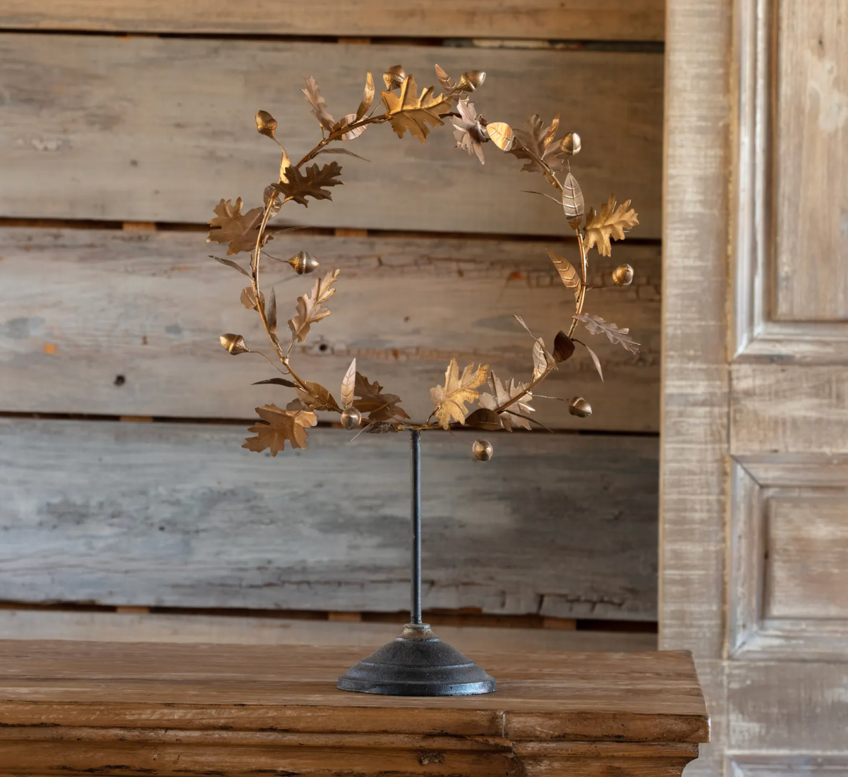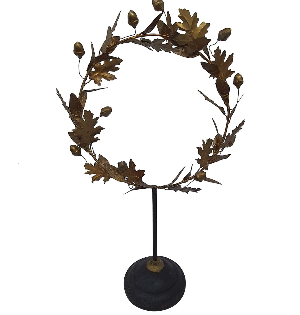 This classic wreath features metal oak leaves and acorns in a golden finish displaced on a vintage style stand.